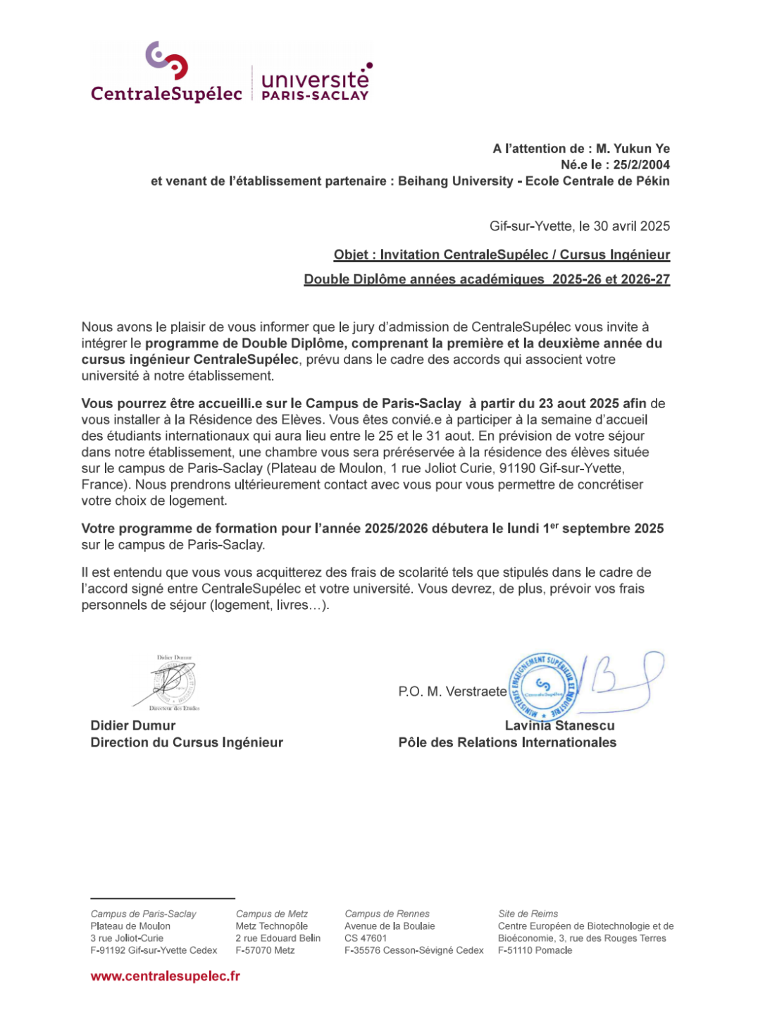 叶雨坤获巴黎中央理工-高等电力学院邀请信