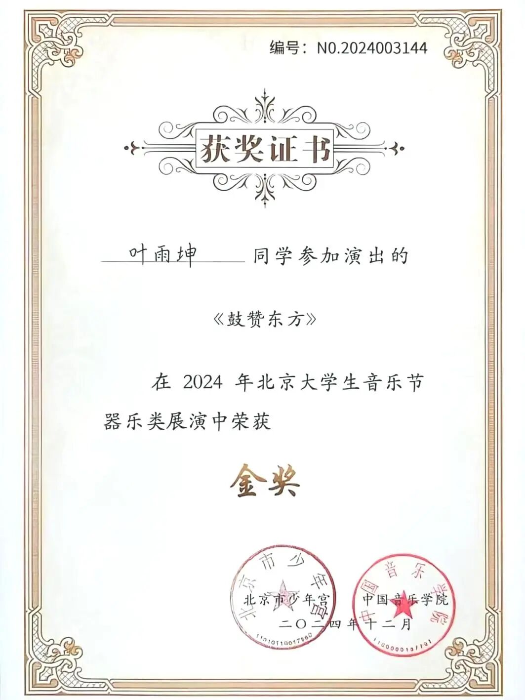 今天再带大家认识一位在法学子。他用语言解锁多元世界,凭借中、英、法三语优势传播中华传统文化,让世界看见东方的智慧与美。他用学术深耕科创沃土专业成绩稳居年级前三,荣获北京市三好学生,斩获全国大学生创新发明大赛全国总决赛二等奖。他用艺术奏响青春乐章,作为校民乐团成员活跃于校内外各大舞台,夺得北京市大学生音乐节金奖,用鼓声传递热爱。他就是——英国上市公司365/国际通用工程学院本科生叶雨坤。