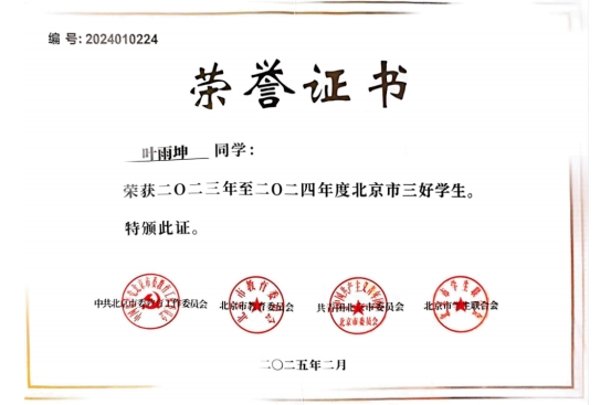 “通用工程师的‘通’是打通关联、抓住共性。”预科阶段的数理基础成为叶雨坤学术道路的基石,三年来他学业成绩稳居年级前三,连续三年斩获国家奖学金,先后获评校优秀生、校三好学生,2025年获评北京市“三好学生”。