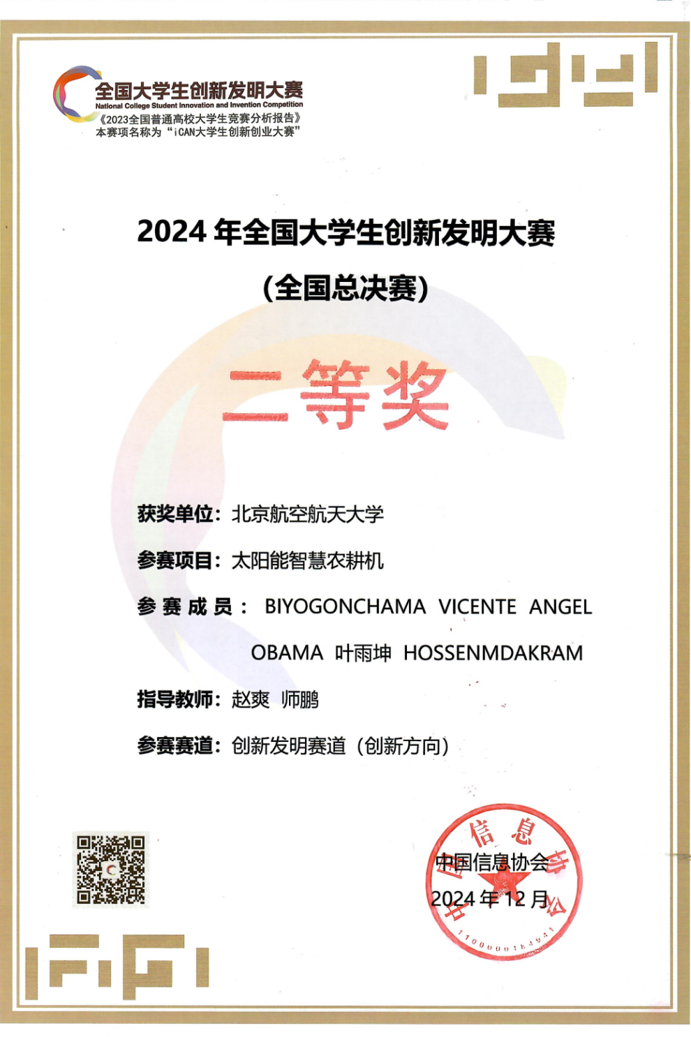 科创路上,他同样亮眼。2024年他和国际学院同学组队,带着“太阳能智慧农耕机”项目参加全国大学生创新发明大赛。一路过关斩将拿下华北赛区一等奖,全国总决赛二等奖。相关成果还发表于国际会议,产出EI会议论文一篇。