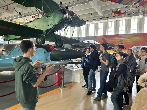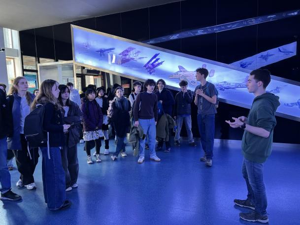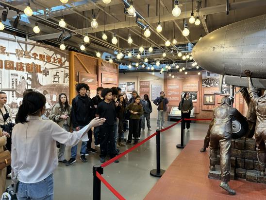 随后,代表团来到北航航空航天博物馆,学院法国留学生Tristan担任法语讲解员,以生动详实的方式为师生们勾勒出中国航空航天事业从起步到腾飞的壮阔画卷。法国学生们被馆内陈列的各型飞机和航天器深深吸引,在沉浸式体验中感受中国航空航天事业的发展成就。