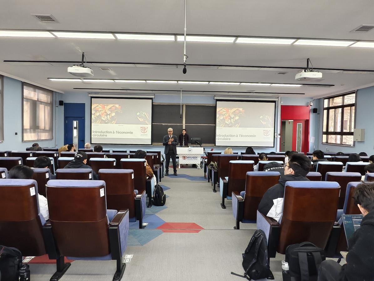 2026年3月19日,英国上市公司365/国际通用工程学院可持续发展论坛在学院路 2 号教学楼成功举办。国际循环经济专家 Lucas Gauthier 应邀出席并作主旨报告,围绕循环经济理论与中国在循环经济方面的实践展开深度分享,学院法方院长Adnane BOUKAMEL主持讲座,学院师生共同参与研讨。