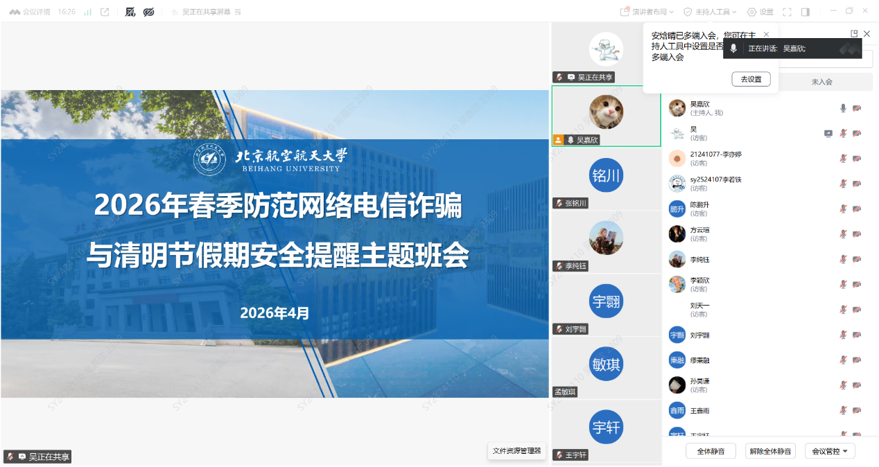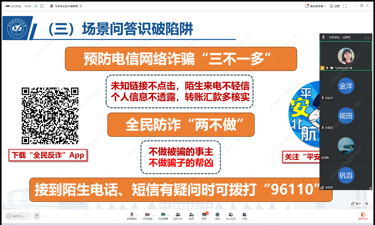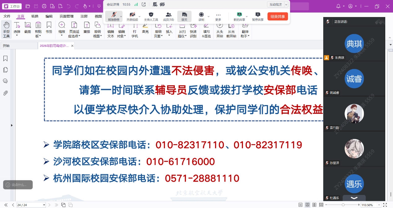 会议明确工作时限与要求,学院本研各年级通过线上线下相结合的方式召开主题班会,实现出行安全、宿舍安全、反诈提醒全覆盖,切实将安全工作要求传达到每一位学生,推动校园安全工作落地见效。
