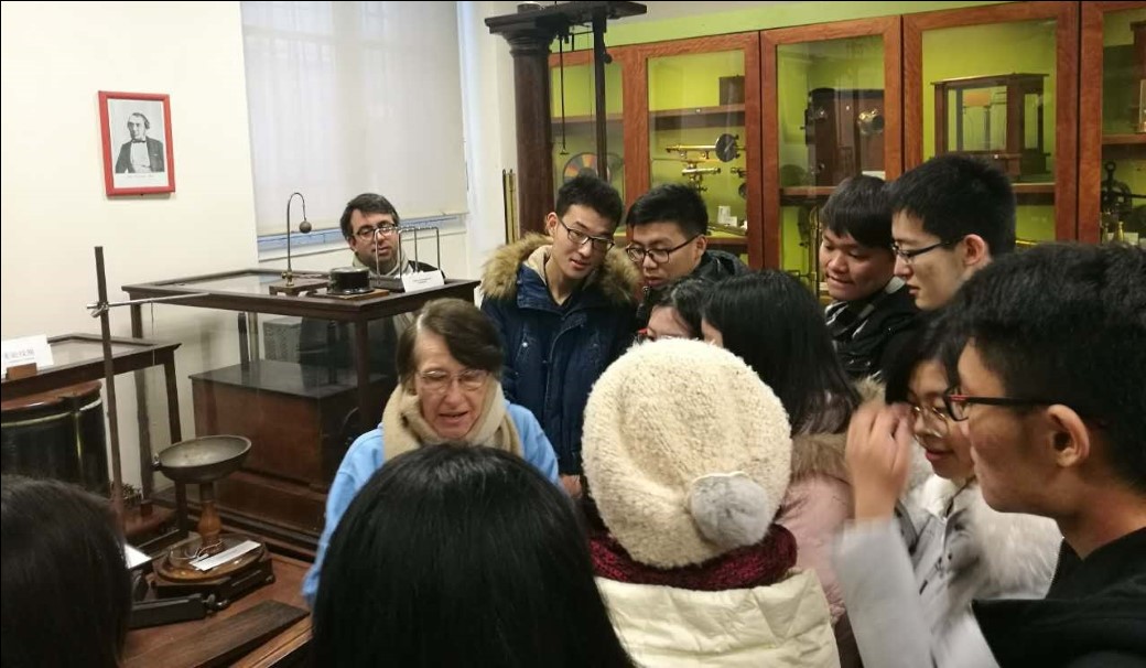 路易大帝中学是一座历史名校,坐落于巴黎五区,周围著名建筑林立,如索邦大学、先贤祠等。如同它的邻校亨利四世中学一样,这所高中以其出色的教学质量和优秀的学生素质而闻名,其中包括中学教育(99%的高考毕业率)和“文、理、商”三科的预科。预科班中,学生考入如巴黎综合理工、巴黎高等师范学院、巴黎高等商学院等著名大学校的比例很高。在游学活动之前,学院帮助学生们与路易大帝中学的20名预科班学生建立了“一对一交流小组”。游学伊始,LLG安排我们参观了他们的科学实验室。在约20平方米的屋子里陈列着各种物理化学实验仪器,墙上挂着百年前的元素周期表。接待老师为我们现场演示了多个经典物理实验,既有趣、更因为浓浓的历史气息而引人流连。