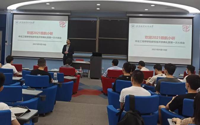活动开始后,首先法方院长GENTY先生用英法双语致新生欢迎词,法方院长欢迎各位中法2021级研究生新生加入到研究生阶段的学习,并热情地表示,他欢迎同学们随时与他交流。