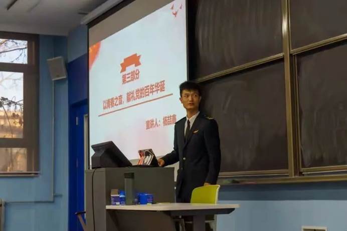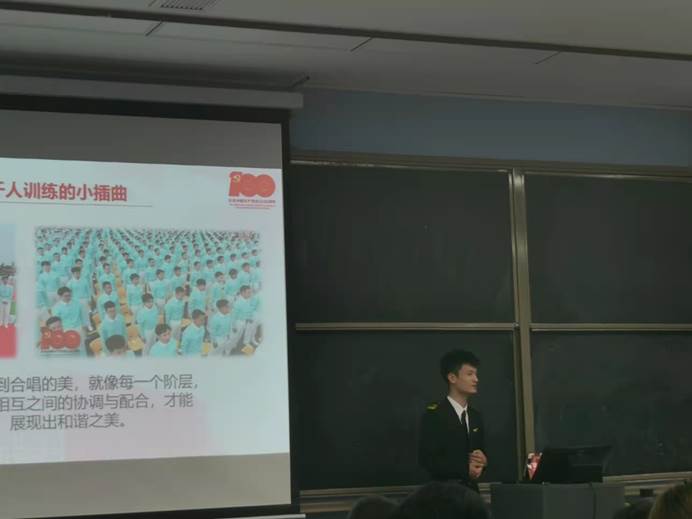 首先是由飞行学院的符洋铭同学带来的主题为《少年正当时,歌唱新征程》的宣讲。他与同学们分享了他在参加七一建党活动中的特殊经历和个人心得。面对意外的脚伤,面对艰难的选择,他选择了坚持下去,拄拐参加每一次排练。最终在自我毅力支持和他人帮助下,他光荣地站在天安门广场上,为党献上青春的赞歌。