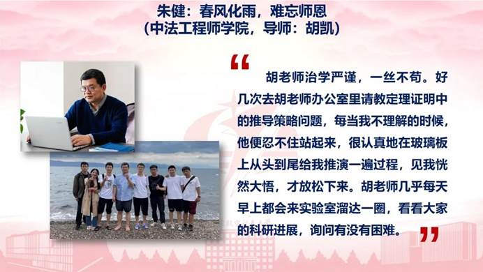 “胡老师治学严谨,一丝不苟。好几次去胡老师办公室里请教定理证明中的推导策略问题,每当我不理解的时候,他便忍不住站起来,很认真地在玻璃板上从头到尾给我推演一遍过程,见我恍然大悟,才放松下来。胡老师几乎每天早上都会来实验室溜达一圈,看看大家的科研进展,询问有没有苦难。”