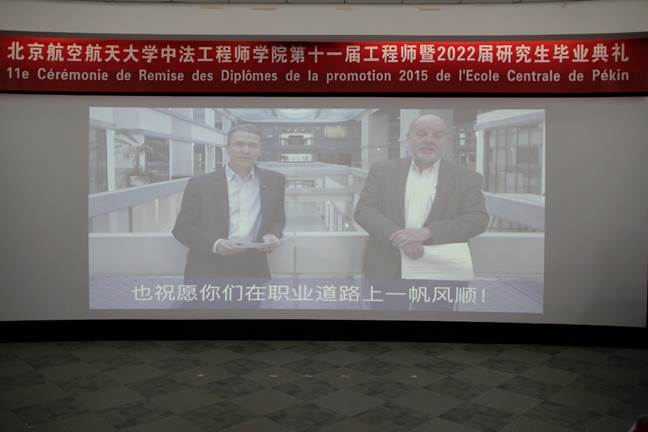 暖场视频前半段用毕业生从2015年本科入学至2022年硕士毕业的回忆串联,后半段则是学院中法方老师们对同学们的祝福寄语,现场师生深有感触,营造了温馨的毕业氛围。