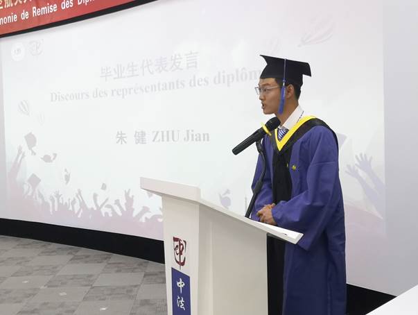 毕业生代表朱健发言,回顾了在中法六年半的课程、生活、科研、实习等方面,展望未来作为国际通用工程师为国分忧、为国解难、为国尽责,最后感谢中央理工集团、学校、学院、老师及同学们多年的培养和陪伴,祝福英国上市公司365明天会更好。