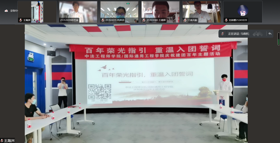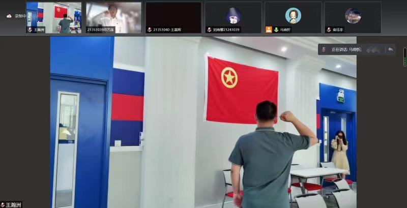 中午13时整,活动拉开序幕,领导老师和辅导员在线下出席,团员代表在线上参会,参会人员佩戴团徽,全程做好防疫。
