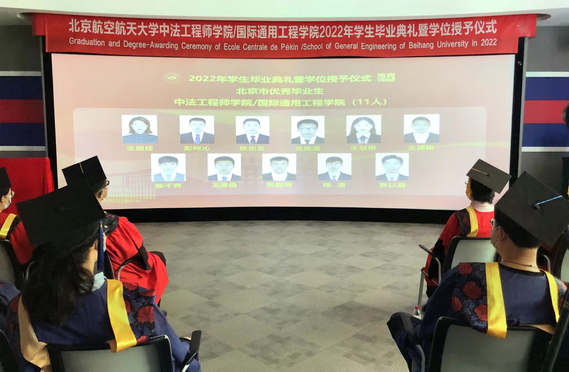 回到学院分会场,学院党委书记张江宣布获北京市优秀毕业生与北航优秀毕业生名单,洪冠新院长和GENTY院长为优秀毕业生代表颁奖。