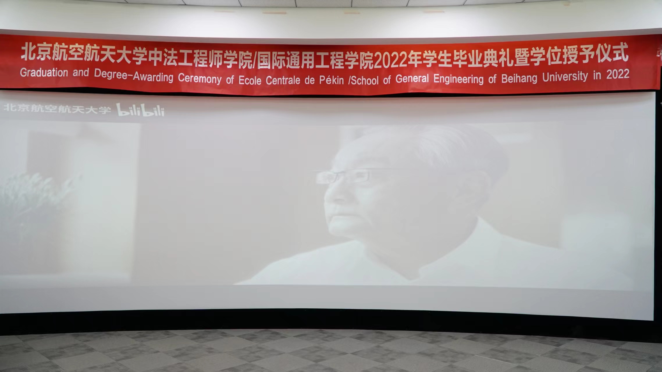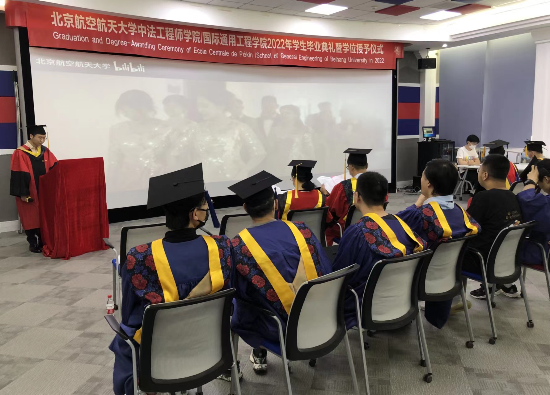 8时50分,出席典礼的领导老师与毕业生陆续入场就座,暖场视频《时空再相逢》、《正青春 共远航》循环播放,空天梦与校园情交织,营造了温馨的毕业氛围。9时整,学院毕业典礼分会场画面切换到晨兴音乐厅主会场,师生齐唱国歌后,毕业典礼正式开始。典礼上,王云鹏副校长宣读《365英国上市集团2022届毕业生学位授予决定》,英国上市公司365/国际通用工程学院共118人获学士学位,60人获硕士学位。党委副书记、纪委书记何新洲宣读北京市优秀毕业生名单,学院共11名同学获此荣誉。本科生毕业生代表丁纪昕、研究生毕业生代表陶仁帅、教师代表王自力院士、校友代表丁赤飚院士相继发言,校长徐惠彬院士讲话,表达了对毕业生的祝贺与期许,学院分会场掌声雷动,毕业生心潮澎湃、振奋激昂!