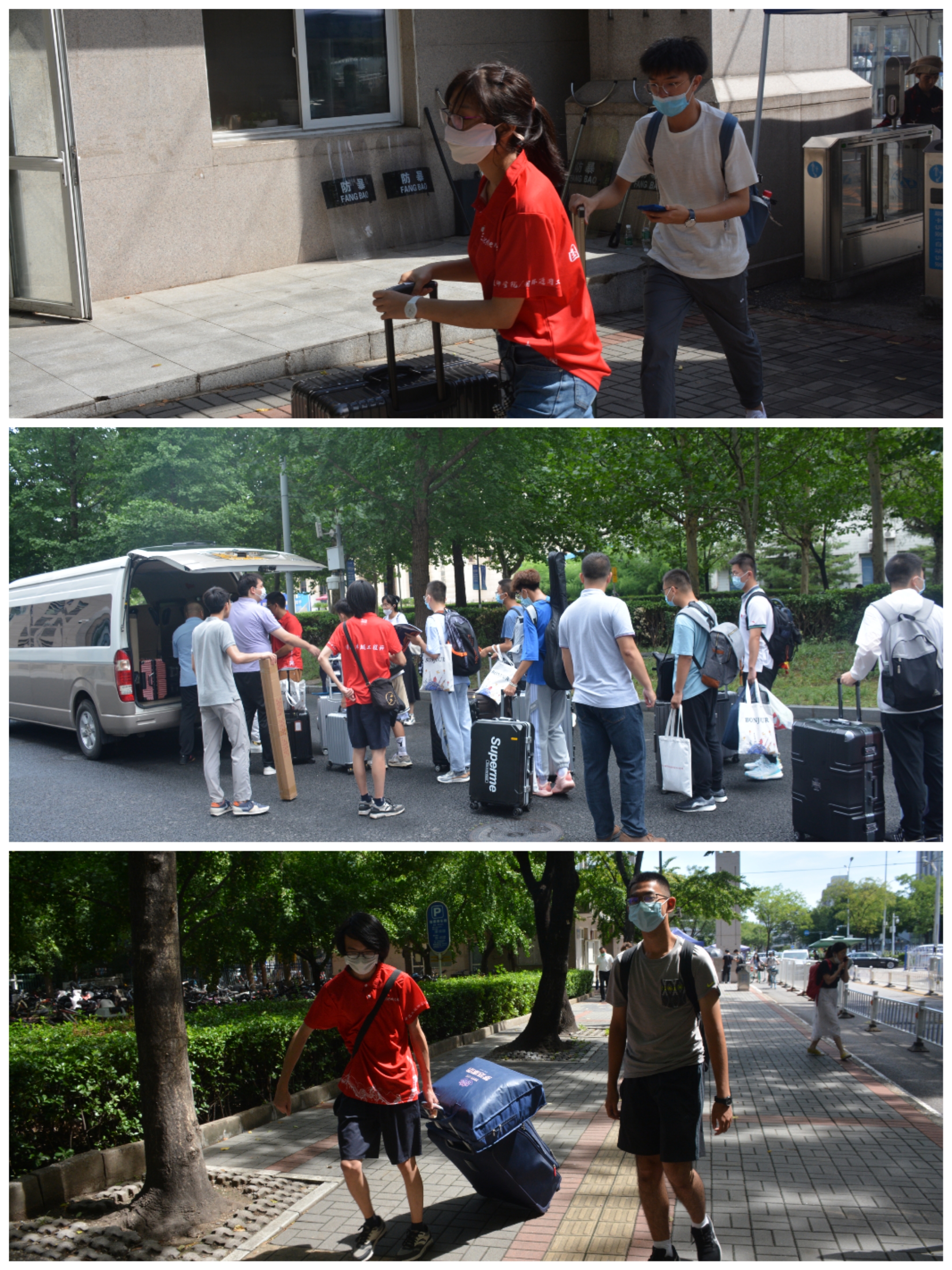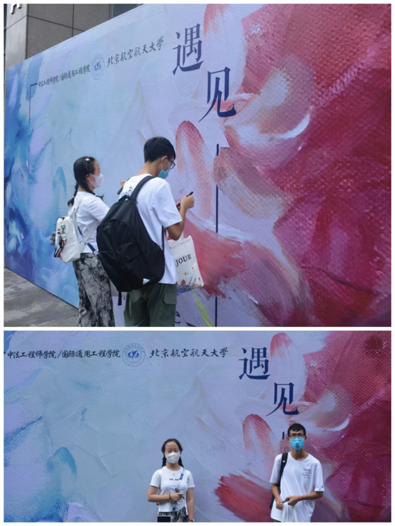 新生们被独具学院特色的签名墙所吸引,在打卡相框拍照留念,留下在北航的首个印记。每一个流程都有热情洋溢的志愿者们耐心细致地解答以及学长们帮助新生搬运行李,将他们送上摆渡车,并一路送达宿舍。