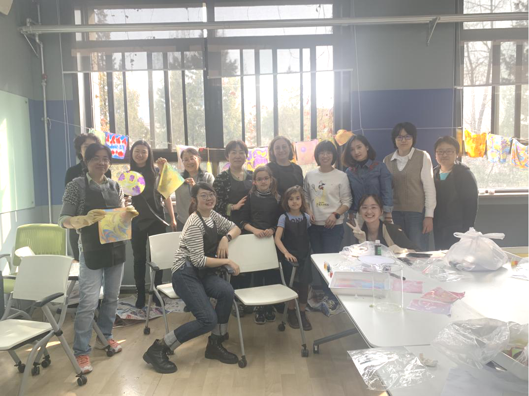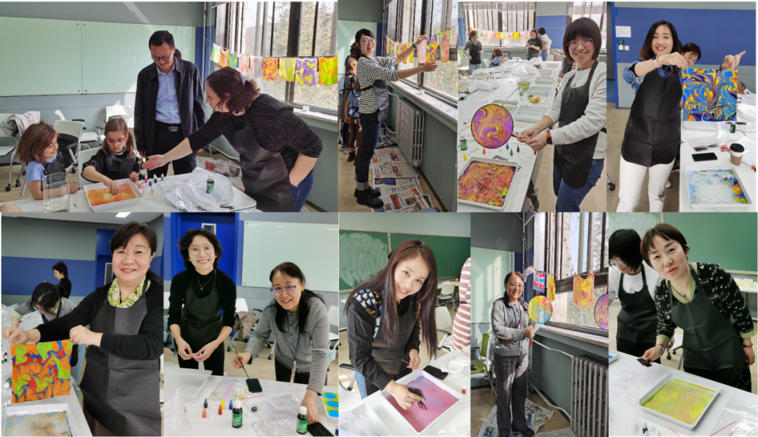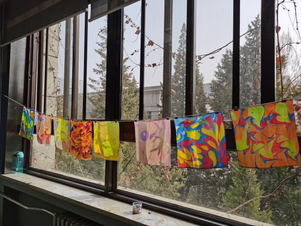 活动中,老师们共同制作了水拓丝巾、团扇。老师们从最基础简单的水拓画入手,通过向水里滴撒各种颜料,使颜料在水中自然交融、变化,形成奇妙绚丽的色彩纹理,再对颜料上轻轻拨动勾勒形成风格各异的画作,利用丝绸的吸附性,把水面上的图案清晰拓印到丝巾上。老师们对自己手工制作的艺术品十分满意,活动在在欢声笑语中顺利结束。