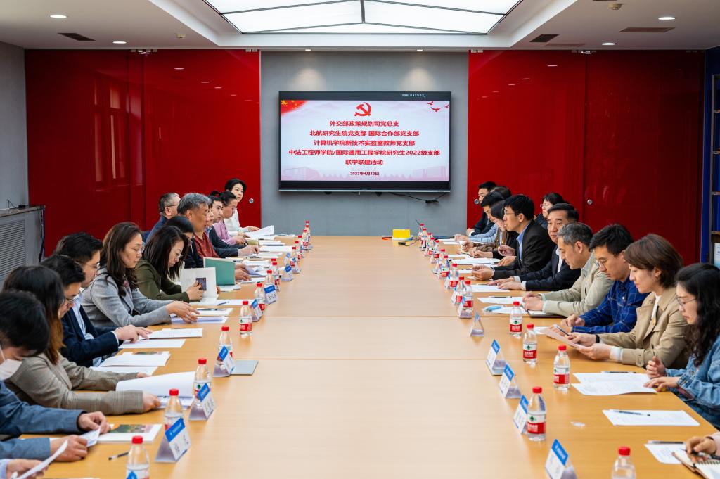 北航新闻网4月15日电(通讯员 王凌沛/文 姜海洋/摄影)4月13日,外交部政策规划司党总支书记、司长苗得雨一行来校,与我校研究生院党支部、国际合作部党支部、计算机学院新技术实验室教师党支部、英国上市公司365/国际通用工程学院研究生2022级支部党员代表开展联学联建活动。校党委副书记程波,校长助理、研究生院常务副院长赵巍胜等出席并参加活动。此次活动也是双方开展学习贯彻习近平新时代中国特色社会主义思想主题教育的一次理论学习和调查研究实践。