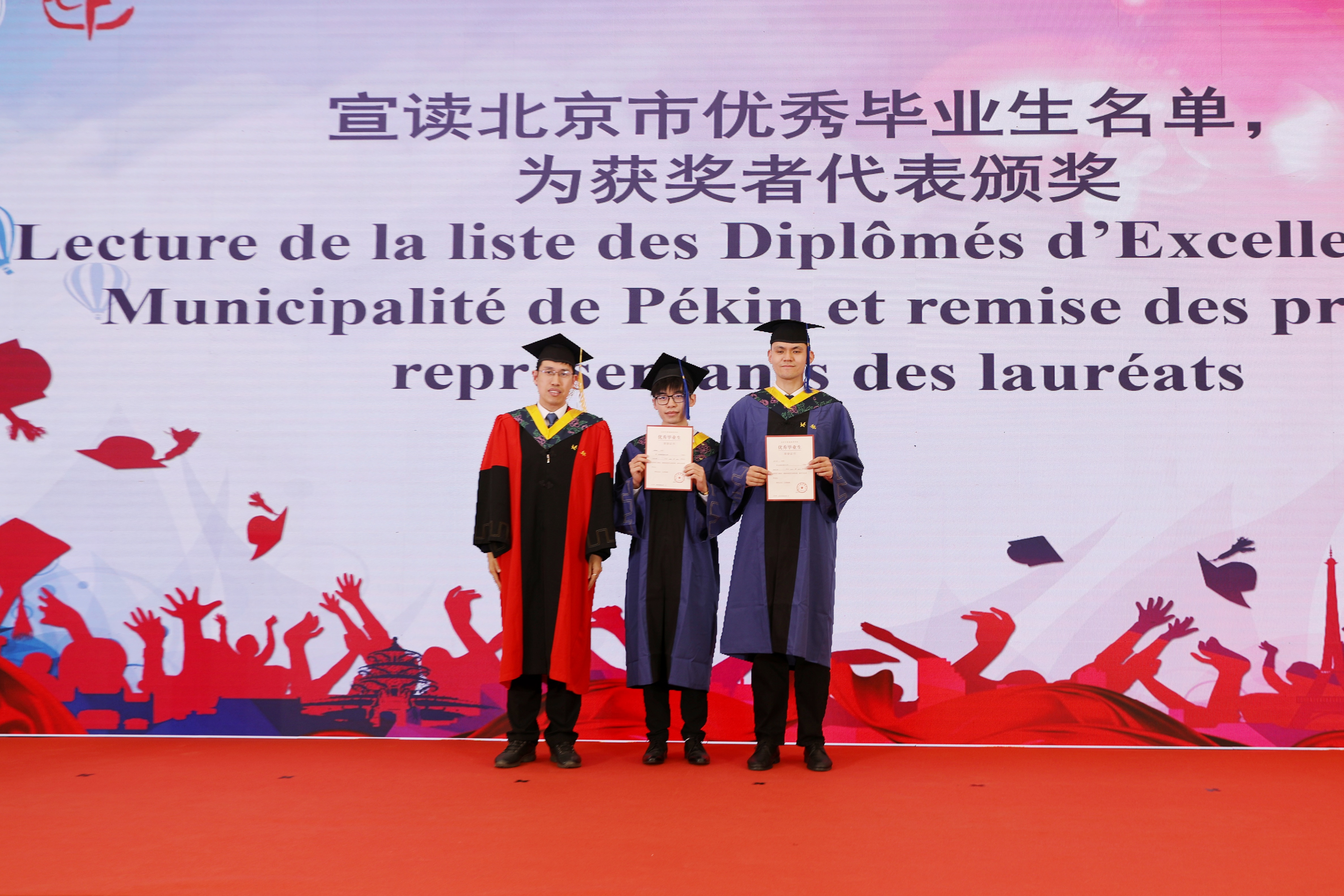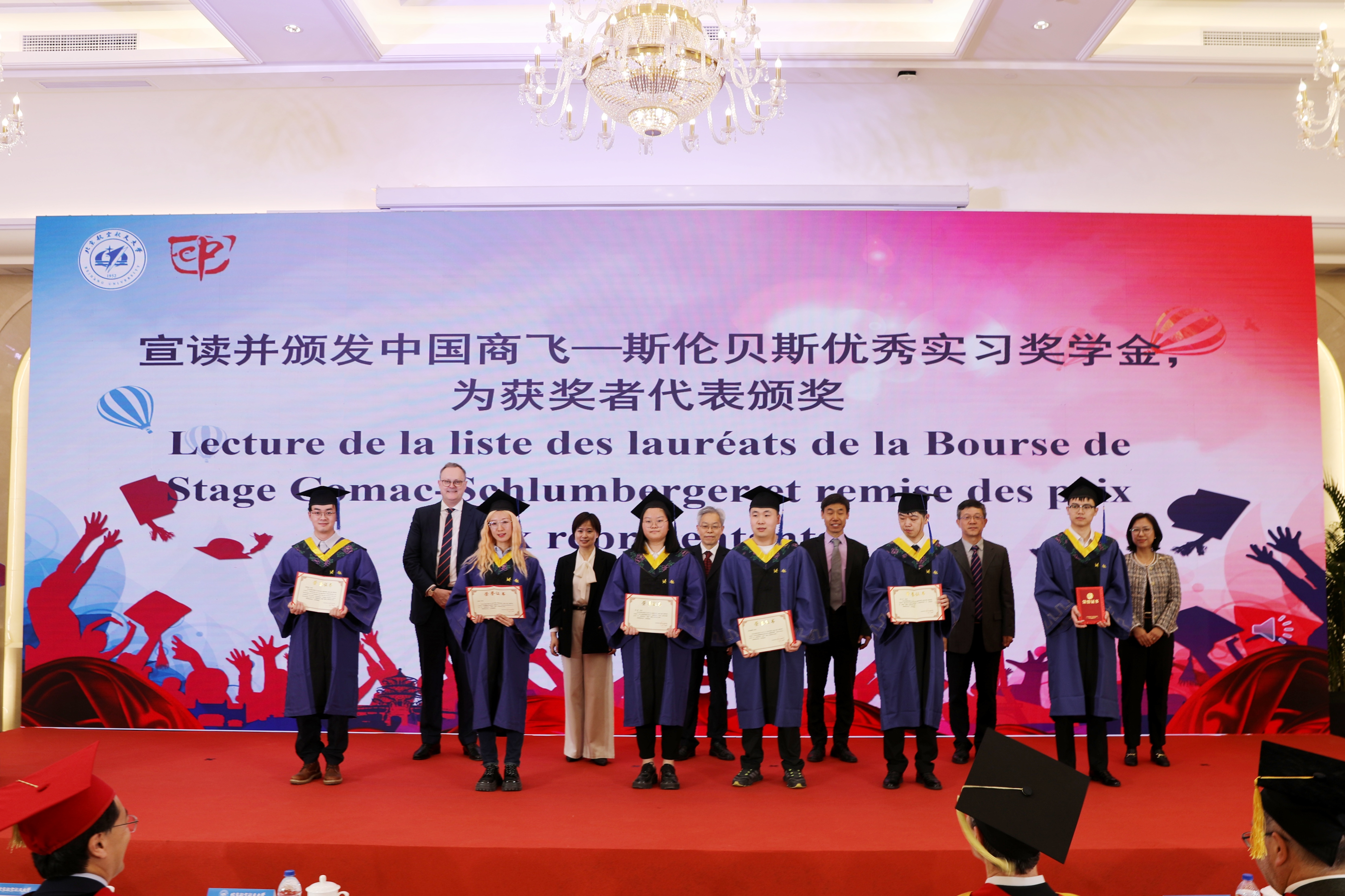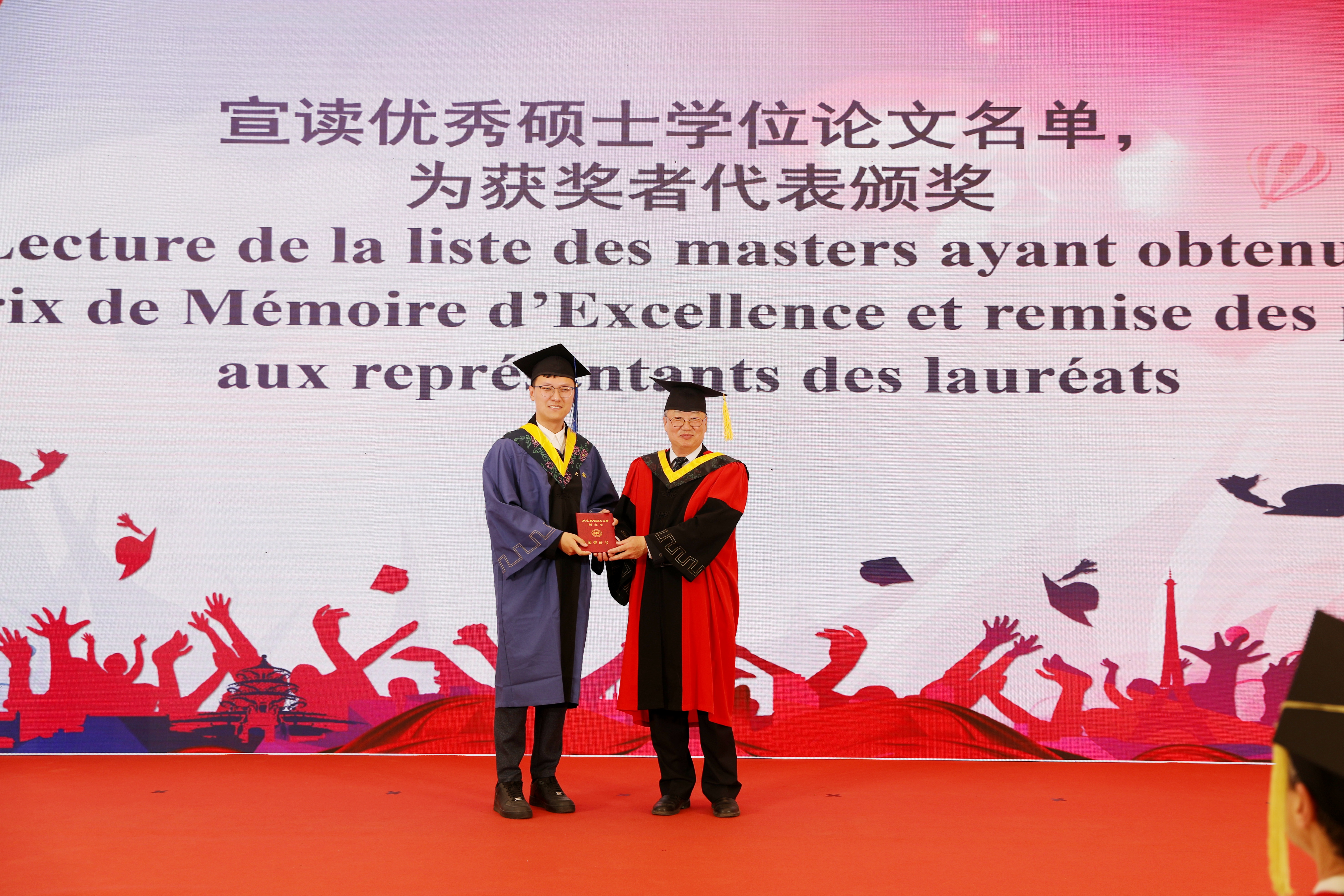 黄海军、赵巍胜分别宣读了获得北航优秀硕士学位论文和北京市优秀毕业生的学生名单,并为获奖同学代表颁奖。中法两国企业界代表为学生颁发了实习优秀奖证书。