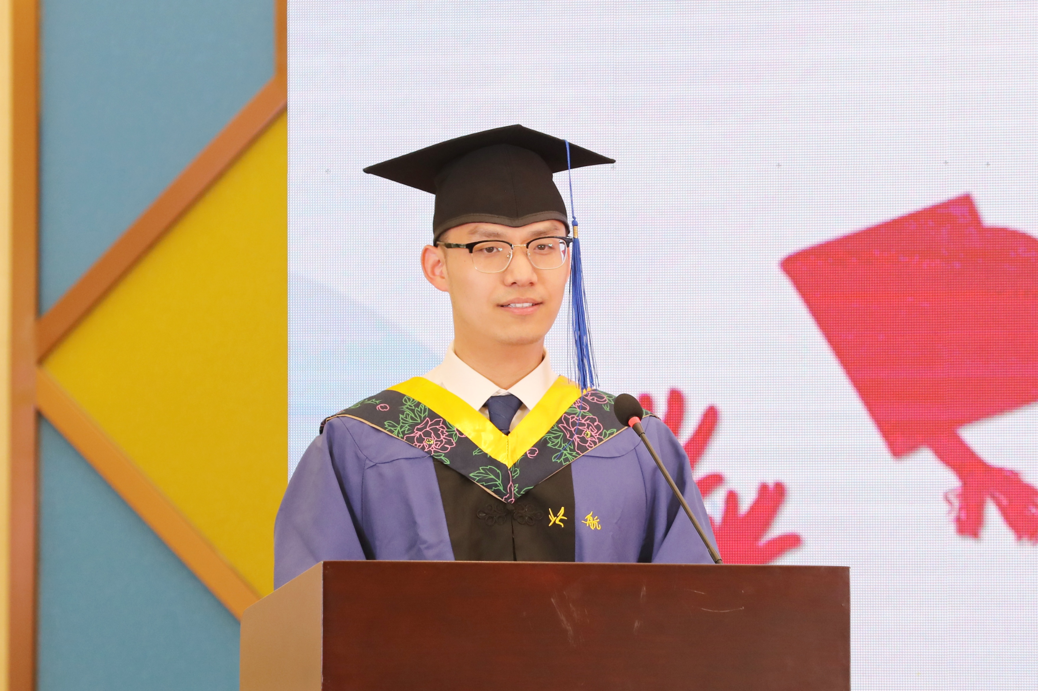 毕业生代表章潇枫分别用中、英、法三语发表了毕业感言。他回顾了同学们在学校里受到的优质教育和在实习中接受的锤炼,祝福所有同学一帆风顺,前程似锦。对学校学院和老师表达了诚挚谢意,感谢学校和学院提供广阔平台、五花八门的课程和丰富多彩的活动,让他们从懵懂少年变成了能够熟练运用三种语言、掌握广博研究基础、能够发现并解决复杂问题的国际化工程师。
