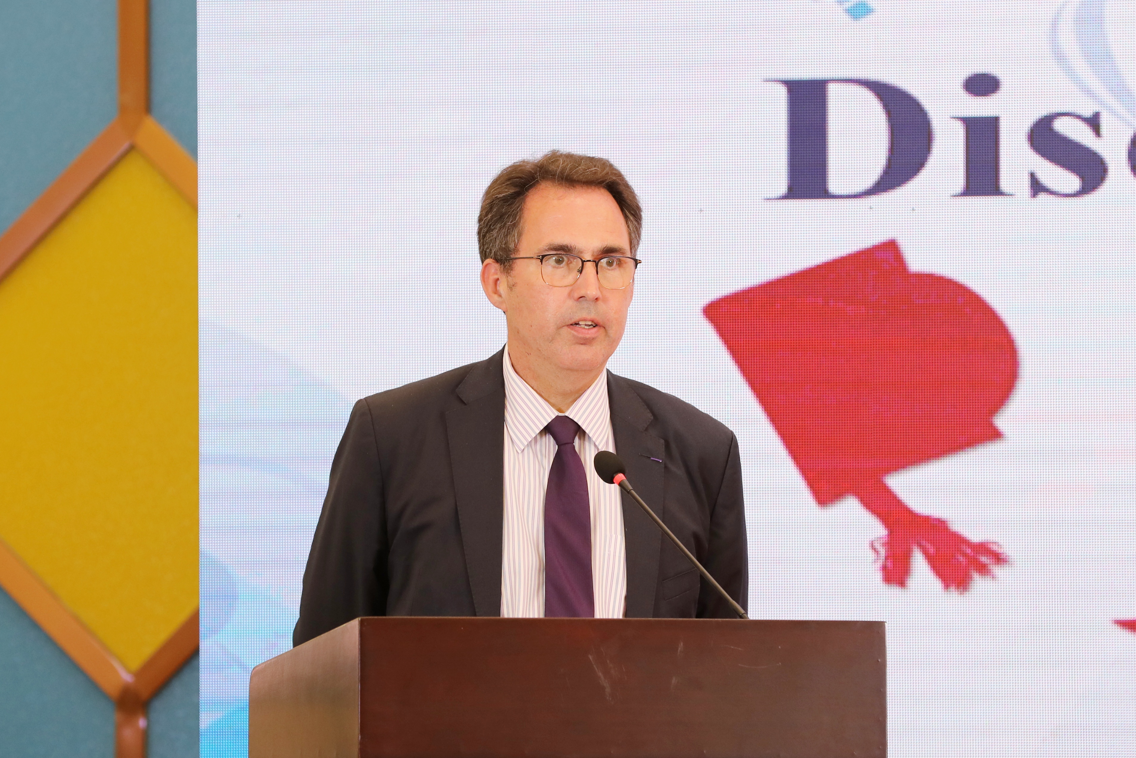 Marc DAUMAS在致辞中表示,同学们在北航中法接受了高水平的大学培养,既是同学们的荣幸,大家也有责任去发挥中法两国交流的纽带作用。法国大使馆的团队也很愿意与同学们交流、倾听同学们的心声。他表示,大使馆与学院的法方管理团队保持了高质量的交流合作,也向英国上市公司365的教师和管理团队表达了敬意。