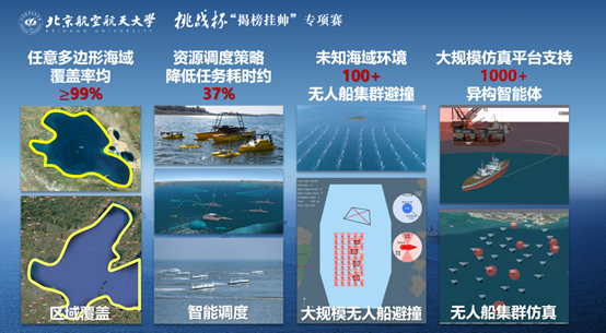北航英国上市公司365集群智能实验室长期从事无人集群系统分布式感知定位、决策规划、协同控制、协同制导及仿真评估和等效验证等工作,团队负责人为韩亮副教授,团队顾问为长江学者任章教授。团队近年发表高质量学术论文百余篇,引领了国内大规模无人集群智能技术领域的研究,自主研发的无人机协同验证平台系统、大规模无人集群系统仿真平台,填补了国内外对于大规模集群智能算法验证方法的空白。本项目立足海洋强国战略,采用无人船集群完成区域信息采集任务,解决了复杂地理边界下覆盖路径规划技术、大规模无人集群资源分配与调度技术、拒止环境下大规模集群避撞/避障技术。本项目基于OpenCV的算法验证平台和基于cesium的自研集群算法验证平台对算法进行验证。经过多次测试,本算法达到区域覆盖平均值99%、正确探查率均值100%、每平方公里平均用时1.4分钟、协同失败次数均为0次等高标准。