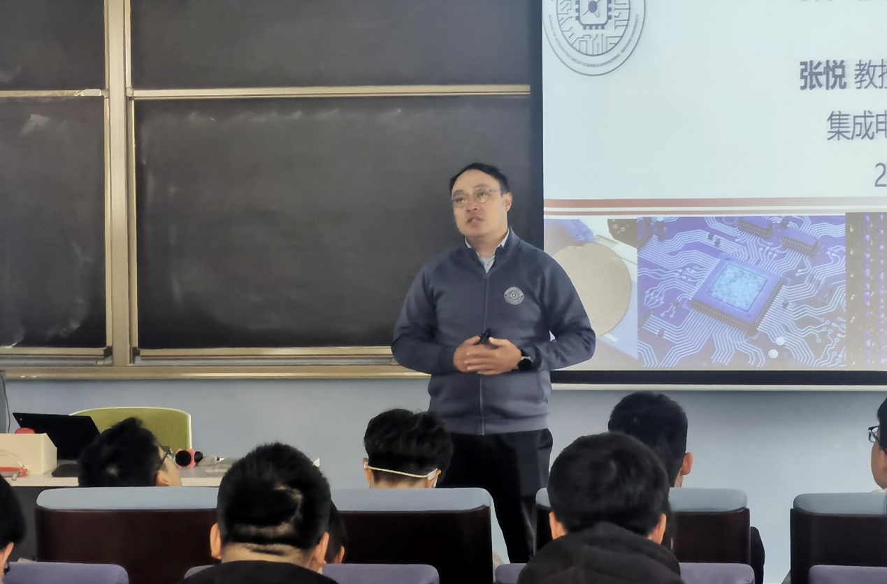 张悦教授以“新时代,‘芯’征程”为题,从学科发展历程、总体布局、师资队伍、平台建设、人才培养五大方面向同学们介绍了集成电路科学与工程学院的发展状况与优势。他从国家战略、行业态势与个人发展三方面出发表达了对同学们的殷切期望,欢迎同学们研究生阶段能够选择集成电路学院导师、加入集成电路研究队伍、共同探索集成电路领域的新知识、新技术,共同为国家集成电路事业发展作出贡献。
