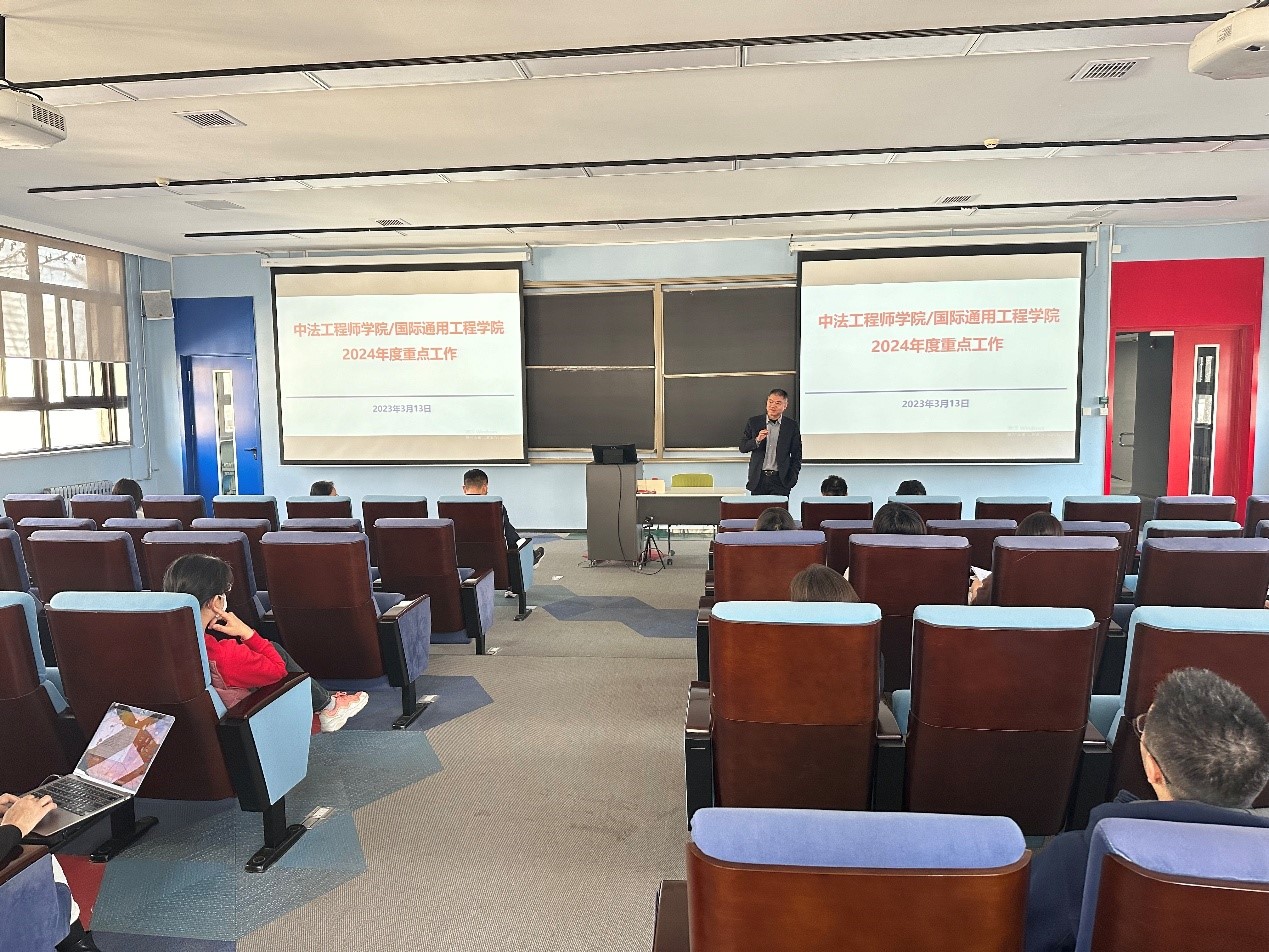 学院院长罗洪斌对学院2024年度重点工作进行了全面部署。2024年既是中法建交60周年,又是学院签约办学20周年,是学院建设发展的关键年。学院将认真贯彻落实学校高质量发展要求,全面提升学院办学质量。他重点从人才培养、科学研究、师资队伍等方面,对加大一流教学资源供给、培育教育教学成果、提升教育教学质量、突出国际化培养特色、开展基础科学研究、打造高能级平台、探索国际科技合作、增强学术影响、加强教师国际交流合作、承办中法合作办学高质量发展论坛暨成果展等工作提出了具体要求,号召全体教师凝心聚力,笃行实干,扎实推进学院各项工作,奋力开启学院发展新篇章。