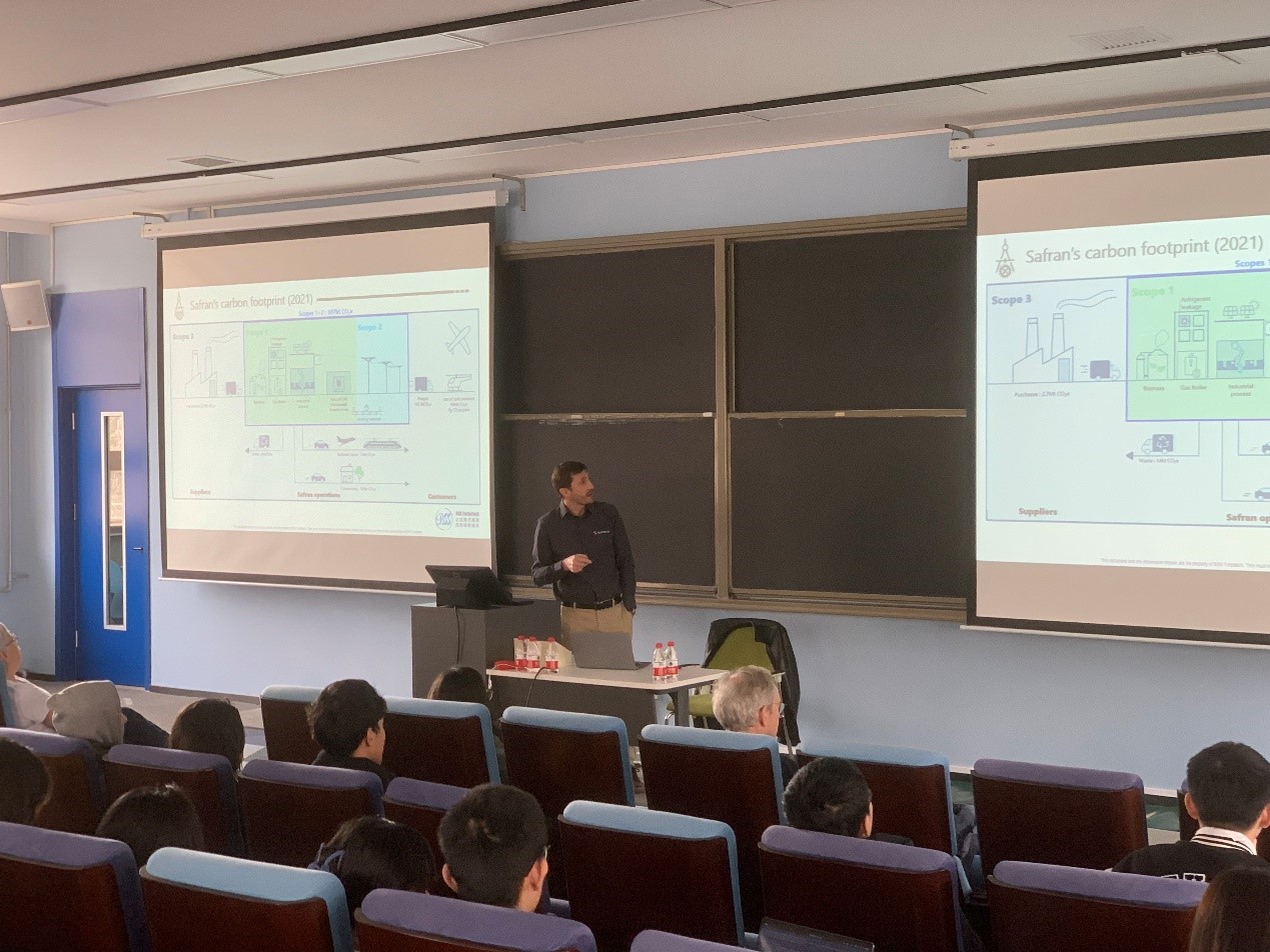论坛由两个环节构成:企业主旨报告和学生现场互动,第一个环节邀请到学院企业合作伙伴赛峰集团北京南方斯奈克玛涡轮技术有限公司总经理Julien PAVILLET先生和法国电力集团(中国)新能源高级技术经理Fabrice CAUFFET先生围绕可持续发展开设专题讲座,讲座环节由学院法方院长Frederic GENTY教授主持。Julien PAVILLET先生围绕航空领域的绿色发展之路中的理念、技术和战略愿景进行了分享,Fabrice CAUFFET先生围绕新能源领域的重要举措以及行业生态进行了分享。专题讲座旨在向学生阐述企业在实现可持续发展过程中遇到的挑战和解决方案,如何将可持续发展理念融入到日常运营中,以及这种做法对企业、社会和环境的影响。