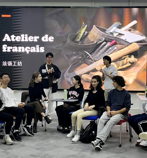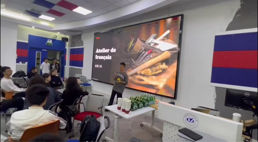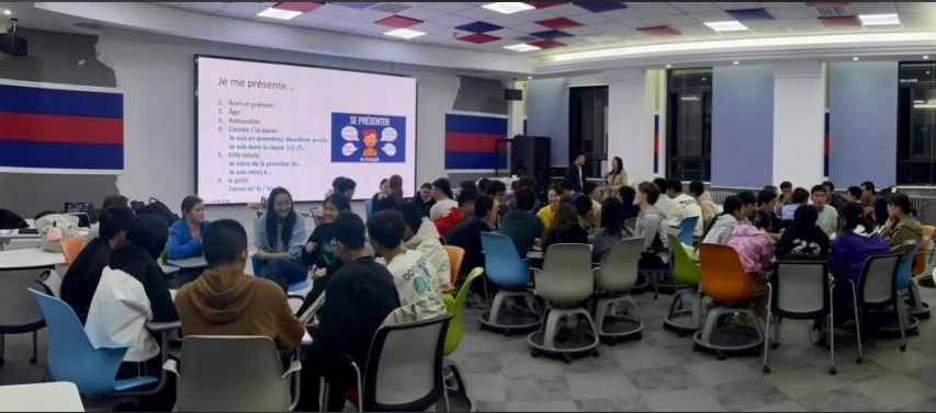 大家随即上台开始自我介绍,中方学生使用新学的法语,留学生们则用中文,文化交流的气息一下子弥漫开来。