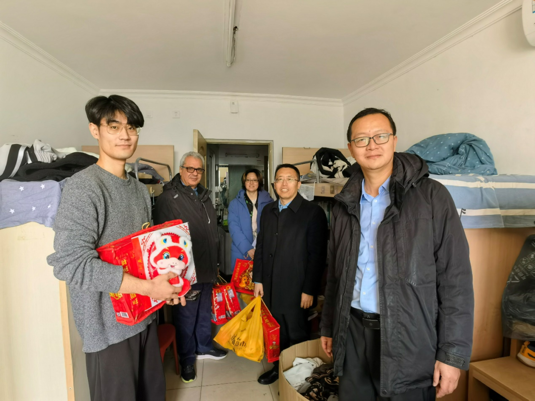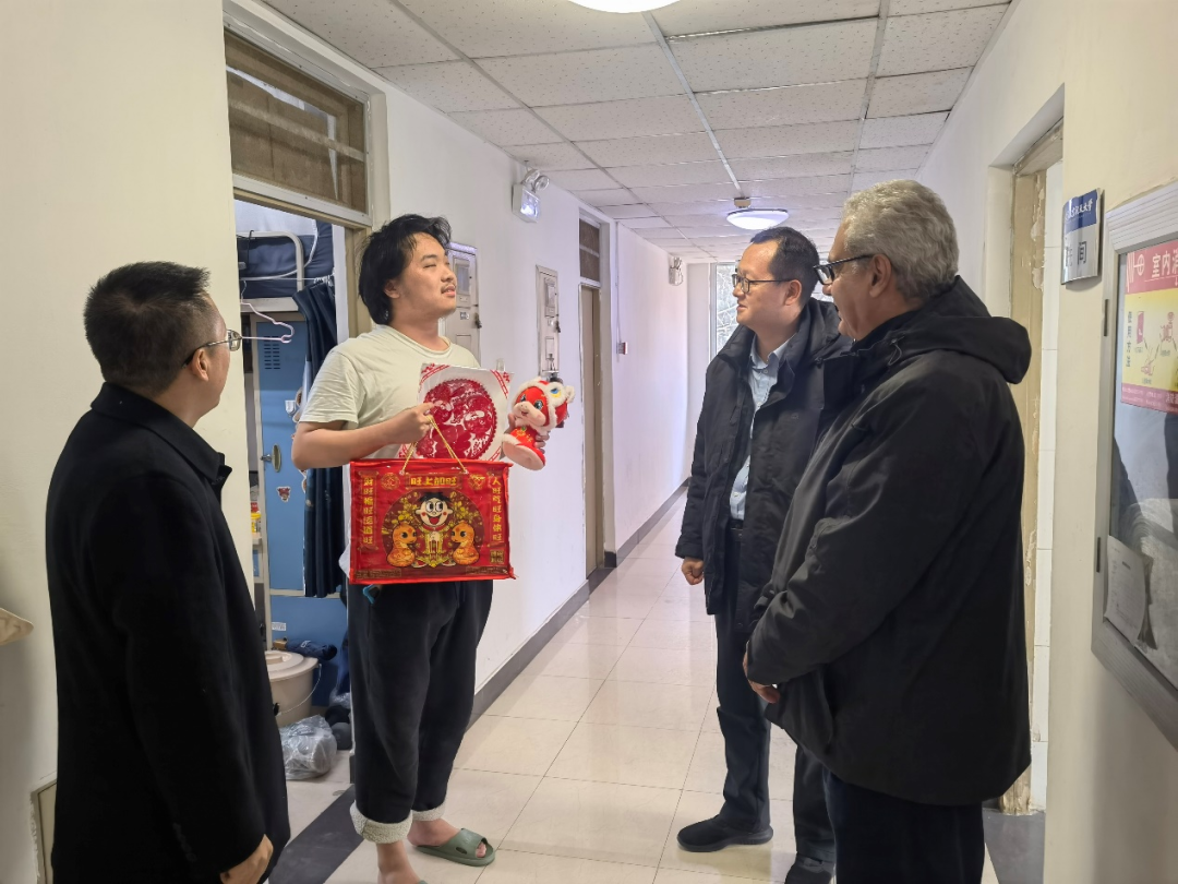 随后,院领导前往校内和大运村的学生公寓,看望目前仍在校的学习和实习的学生。学院领导与学生亲切交谈,详细询问他们的生活安排和学业计划,并为每位学生送上了学院精心准备的新春礼包。礼包中包含春节特色食品和蛇年吉祥物,传递了学院的关怀与浓浓的节日祝福。同学们对学院的问候和关爱表示感谢,纷纷表示,学院的关心让他们感受到家的温暖。