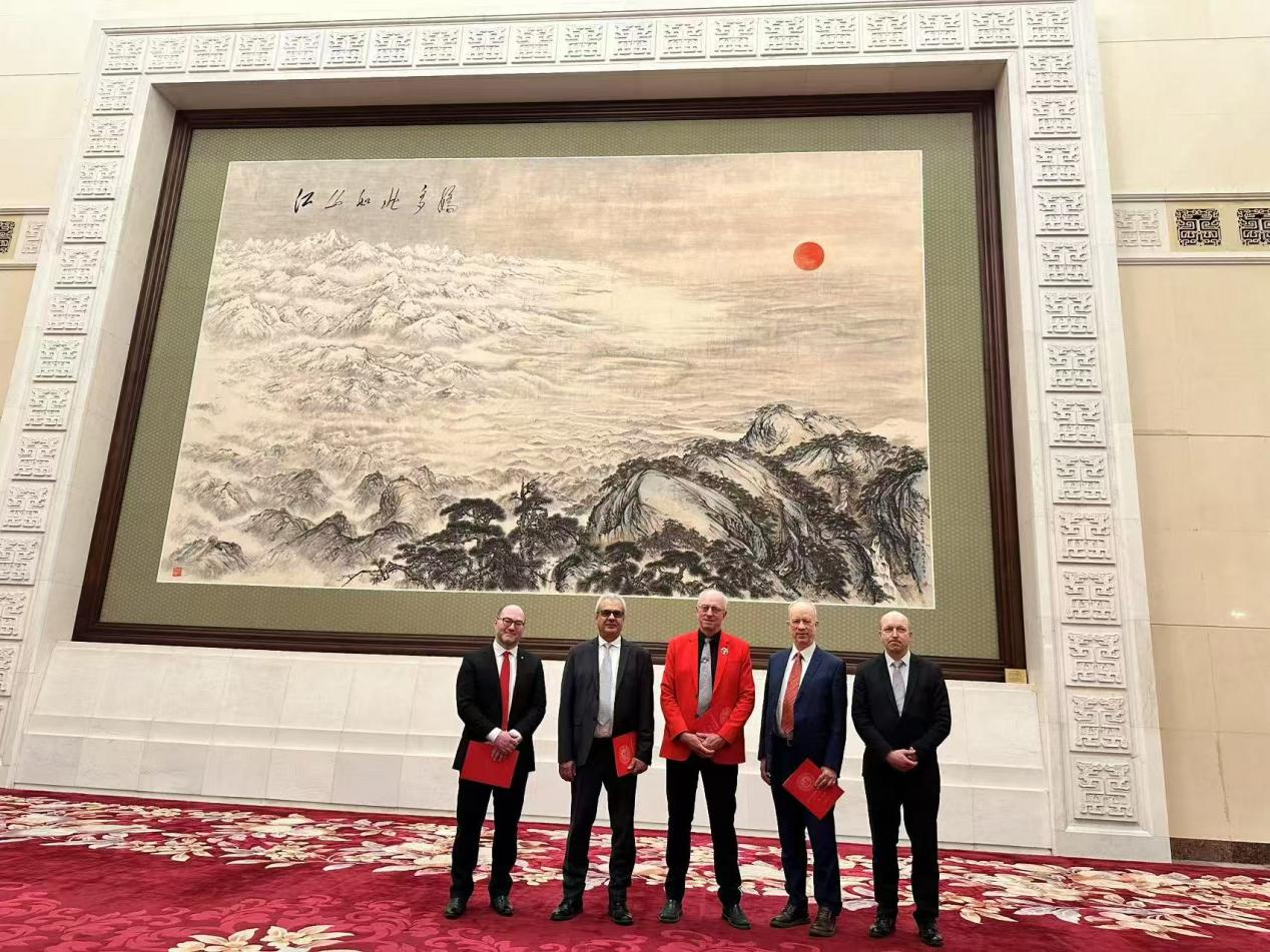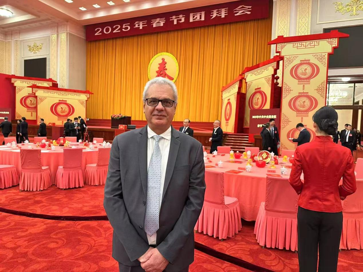中共中央、国务院1月27日上午在人民大会堂举行2025年春节团拜会。中共中央总书记、国家主席、中央军委主席习近平发表讲话,代表党中央和国务院,向全国各族人民,向香港特别行政区同胞、澳门特别行政区同胞、台湾同胞和海外侨胞拜年。习近平强调,即将过去的甲辰龙年,是我们振奋龙马精神、历经风雨彩虹的一年。一年来,面对复杂严峻形势,我们沉着应变、综合施策,攻坚克难、砥砺奋进,中国式现代化迈出新的坚实步伐。受国家人力资源和社会保障部邀请,我院法方院长Adnane Boukamel教授与其他四位国际专家参加团拜会。
