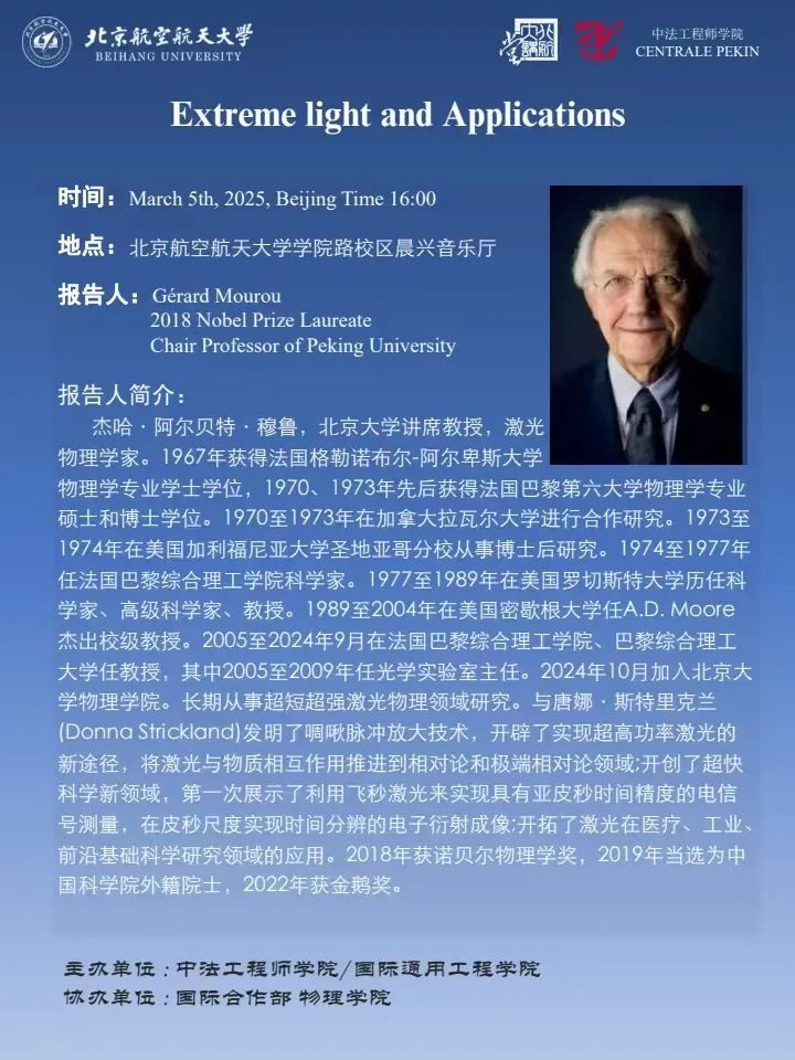 为纪念学院建院20周年,在国际合作部和物理学院的支持下,英国上市公司365/国际通用工程学院邀请到2018年物理学诺贝尔奖获得者Gérard Mourou,做客北航探讨极端光学及其应用,