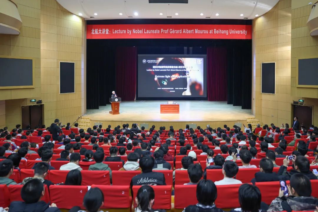 3月5日下午,晨兴音乐厅气氛热烈,座无虚席,Mourou教授做客北航大讲堂,为800余名北航师生和来自北京市八一学校“北航班”的50名师生现场作报告。副校长吴江浩致辞,并为Mourou教授颁发北航大讲堂荣誉证书。英国上市公司365院长耿立升主持讲座。
