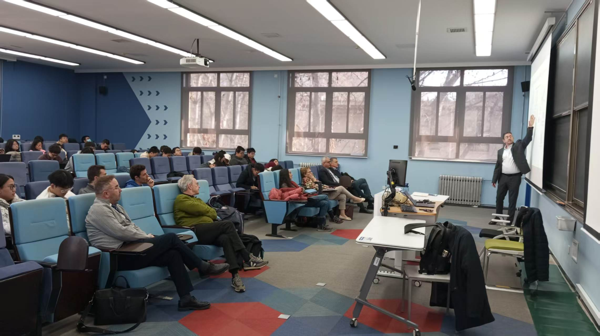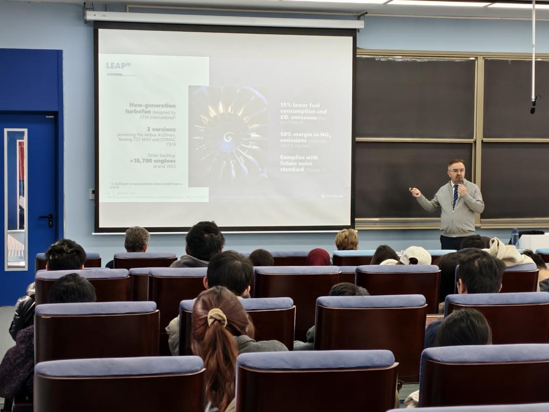 第一个环节邀请到学院企业合作伙伴赛峰集团北京南方斯奈克玛涡轮技术有限公司的CEO David LASNE和法国电力集团的CTO BRUNO PECHINE围绕可持续发展开设专题讲座。David LASNE围绕航空航天领域,尤其是航空发动机的低碳化战略进行介绍。他指出,提高燃烧效率、开发可持续航空燃料及新型推进技术至关重要。BRUNO PECHINE主要介绍了氢能源等新能源及其应用。他在演讲中表示,氢能作为零碳燃料,在短途航空、无人机及地面辅助设备中具有巨大潜力,并指出基础设施、储氢技术和成本仍是当前主要挑战。