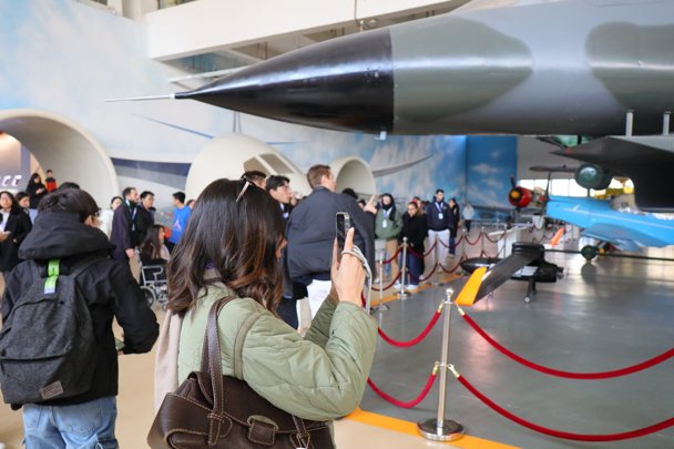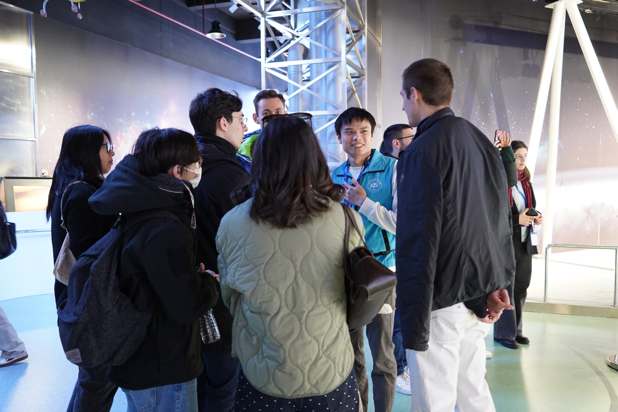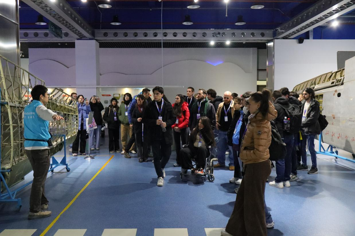意大利学生团首先参观了航空航天博物馆,现场由航空馆讲解志愿者黎宏隽做英文讲解。交流团成员通过“长空逐梦”“银鹰巡空”“空天走廊”“神舟问天”四个展区,不仅近距离观察飞机零部件,探知航空技术奥秘,还从一架架完整的飞机和一系列飞机模型中了解人类航空航天发展史,同时也对中国航空航天事业发展有更进一步认识。意大利学生们对航空领域展现出了极大的兴趣,他们认真聆听讲解,不时提出问题,与讲解员进行互动交流;他们驻足惊叹,用镜头记录下这些象征北航自主创新精神的名片。