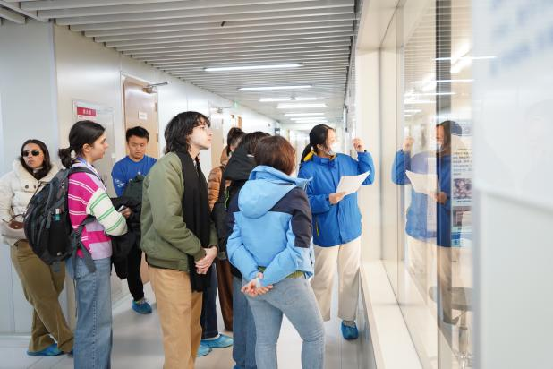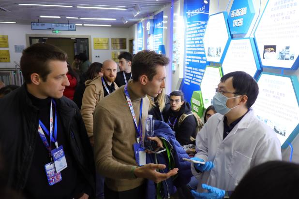 随后,意大利学生团参观北航智能微纳公共创新中心实验室。学生们分成两组,由实验室郑翔宇老师和两名学生带领他们参观。讲解员首先介绍智能微纳技术的基本概念和研究方向,让学生们对微纳有了更具体的认识。通过“高精度光刻机”“扫描电子显微镜”等高精尖设备仪器的介绍,了解到微纳技术的应用,同时也向同学们展现其在微纳技术领域的前沿成果和科研实力。现场许多意大利学生对实验室的研究产生了浓厚兴趣,就实验室科学研究和方向提出问题。现场师生互留联系方式,期待未来科研合作机会。
