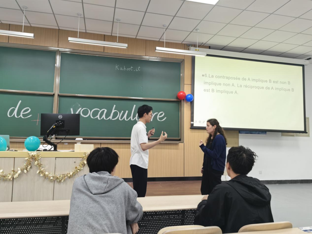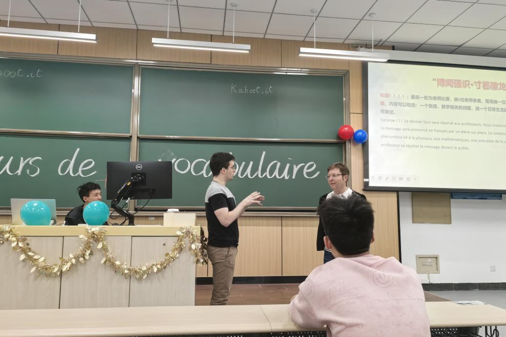 这一环节考察数学物理的TD题目、综合法语词汇、看图识词以及单词乱序还原,一共70道题。这一环节,利用了法国同学推荐的Kahoot.it网站,多彩的页面和全新的答题模式极大地提高了同学们的积极性,也使同学们得到了放松。然而题目的难度逐渐提高,问题与选项都变得复杂难懂起来。同学们从最开始的漫不经心,逐渐转变为了之后的全神贯注。不过,题目的趣味性让现场的氛围多了一丝轻松活跃,少了一些紧张严肃。同学们其乐融融,为实时更新的排行榜感叹不已。