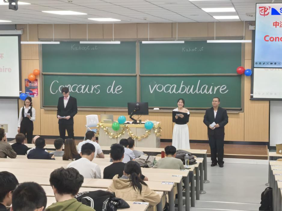 为了提高同学们对法语的学习热情,在学院物理组、数学组和法语组指导下,学院学业支持中心经过三个多星期的准备,4月10日在主M301教室举办了第二届斯伦贝谢杯法语词汇大赛。斯伦贝谢公司工程师、学院校友李婷女士,中法双方教师和大一全体同学参加了比赛。本次活动旨在提高同学们对法语的学习热情、促进老师同学间的沟通协作。四位主持人不断排练、为大家带来了精彩的解说。同时,本次大赛的赞助方斯伦贝谢为同学们准备了丰厚的参赛礼品,激发出同学们更大的热情与力争上游的决心。