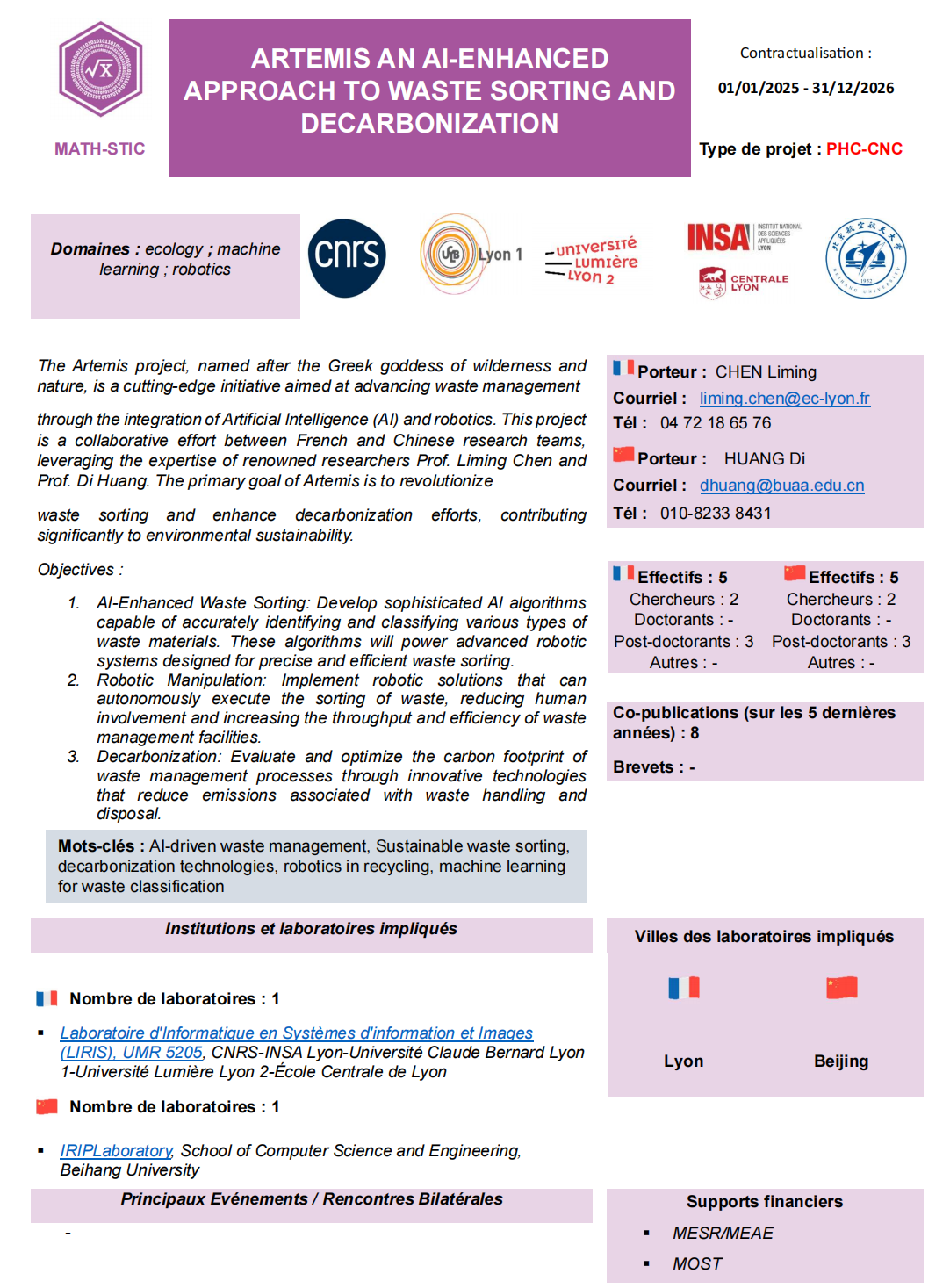 近日,北航-中央理工大学集团碳中和联合实验室(BCC Lab)成员,北航计算机学院黄迪教授和里昂中央理工大学Liming CHEN教授联合申请的项目《人工智能增强的废物处置与碳中和方法》(Artemis: An AI-Enhanced Approach to Waste Sorting and Decarbonization)成功入选2025年度“中法科研伙伴交流计划”(法方称“中法休伯特·居里安合作计划”、“蔡元培科研课题计划”),同时被列为中法碳中和中心(CNC)合作框架2025年度代表性研究项目。