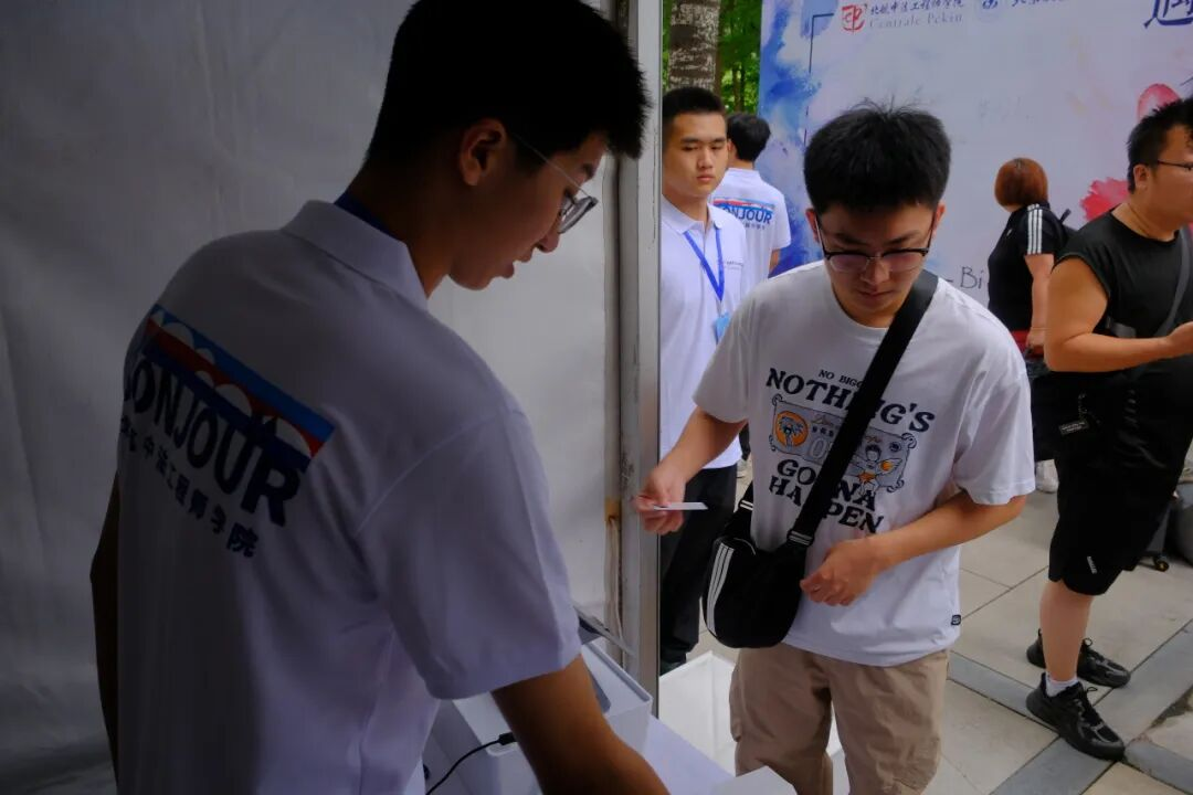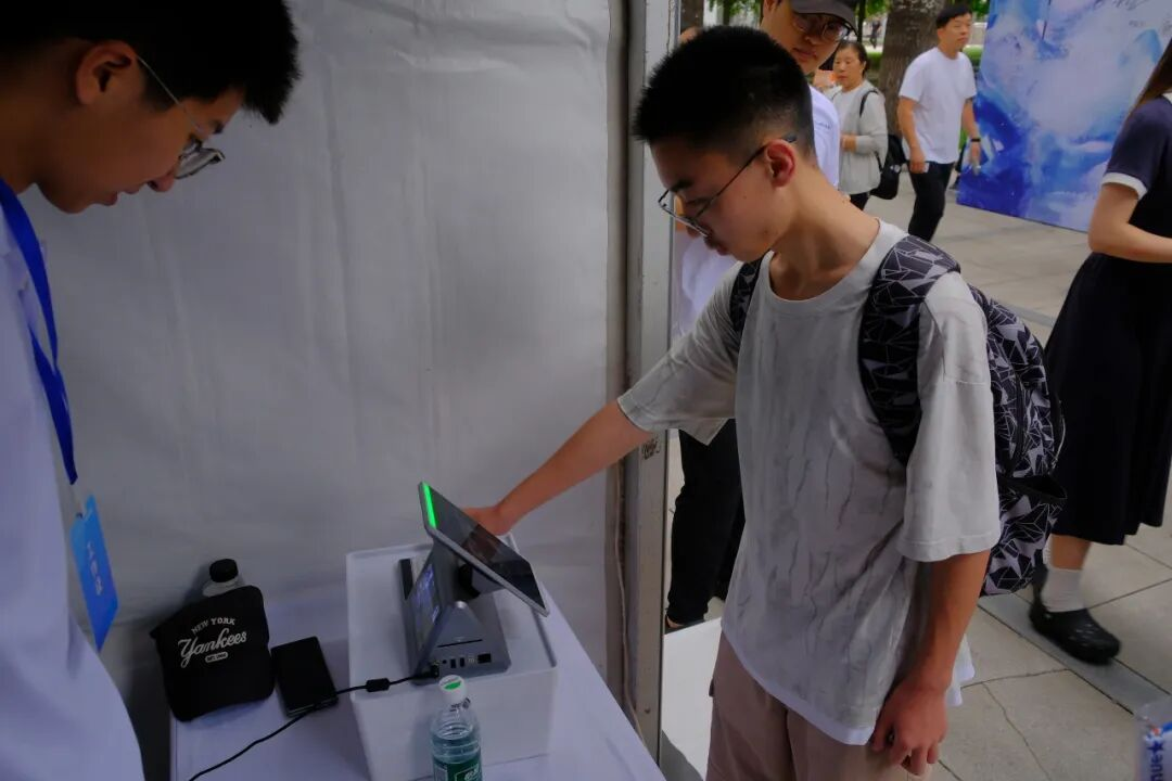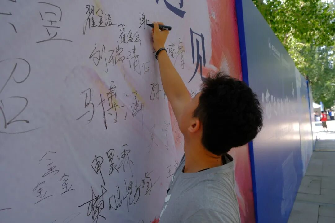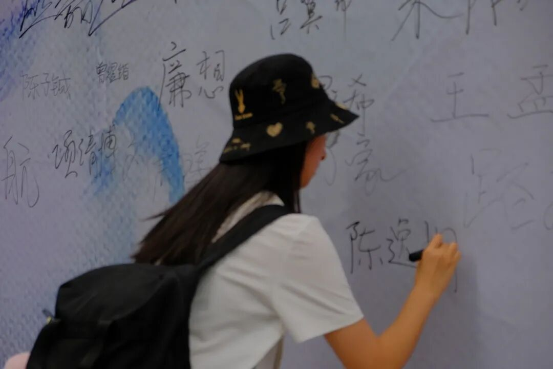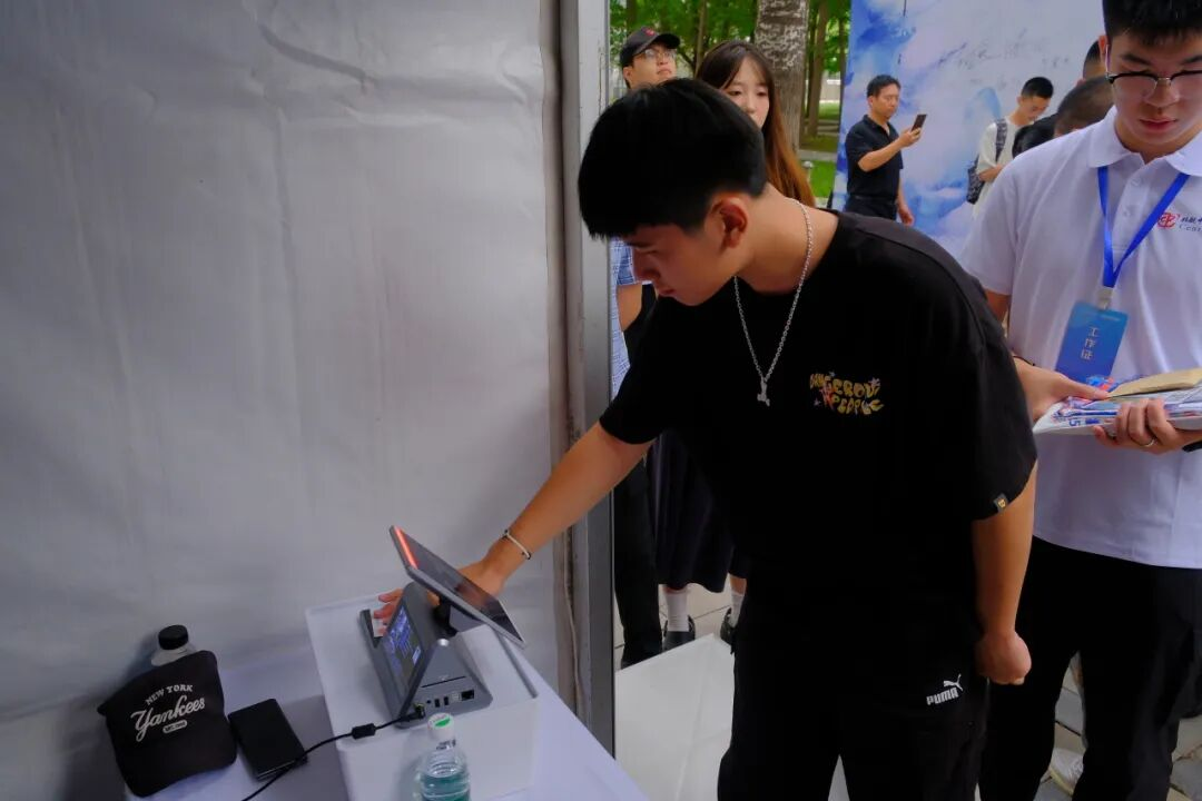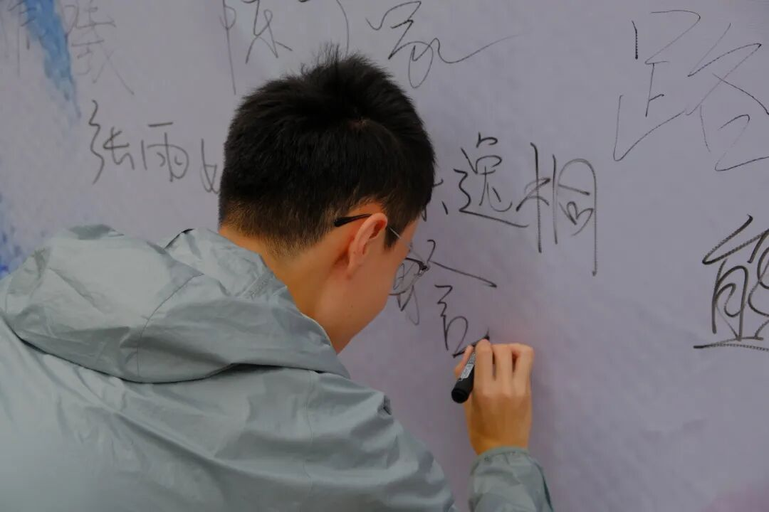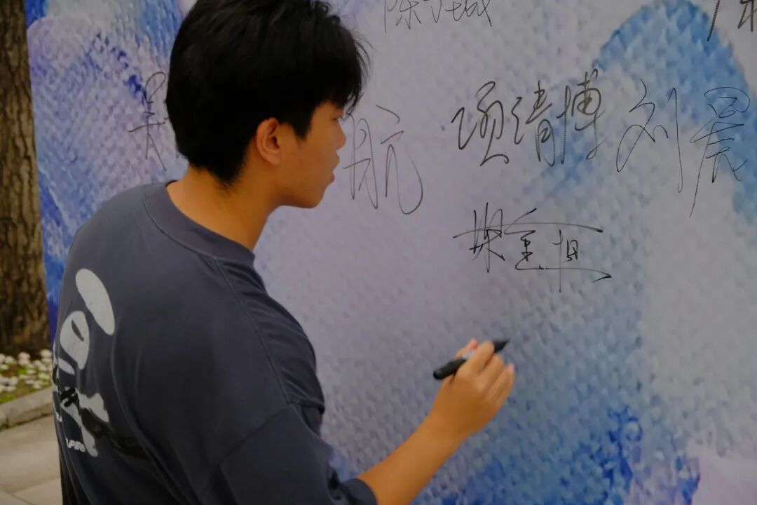 完成人脸识别后,志愿者双手递上学院为新生准备的专属迎新礼包并引导他们走向签名墙,用笔留下了自己在大学的第一处痕迹。