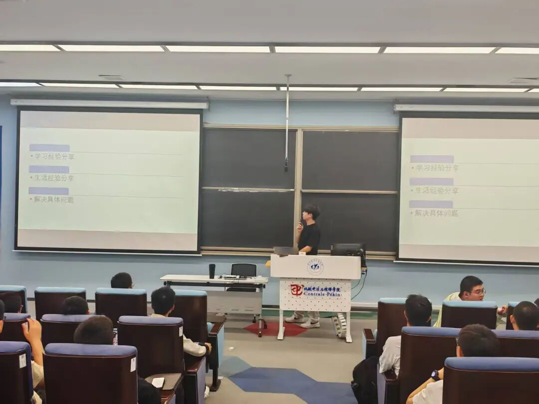 首先由沈禹涵学长以高中时的数学学习作为类比,为新生们生动地解决了有关法语学习的问题,同时用幽默风趣的口吻,与新生们分享了自己大一丰富多彩的生活。