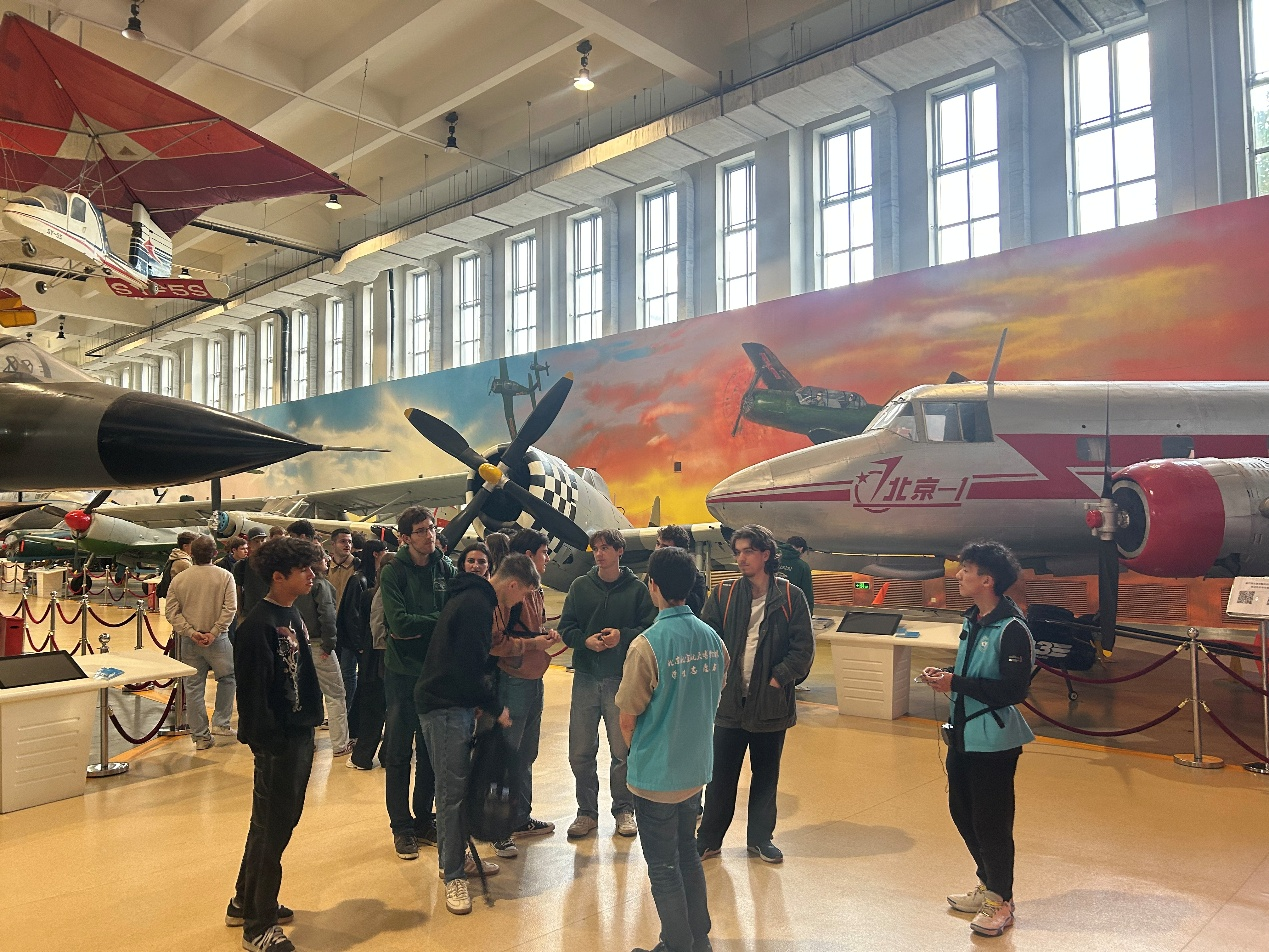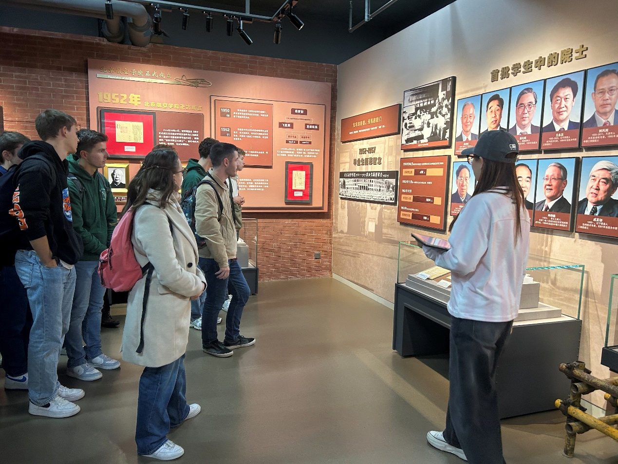 下午,师生团队先后走进航空博物馆与校史馆。在航空博物馆,志愿者以 “长空逐梦”“银鹰巡空” 等展区为核心,结合实物展品讲解人类航空航天发展历程,让来访师生直观感受中国航空航天事业的蓬勃活力;在校史馆,讲解员通过历史图片、实物展品,生动讲述北航建校初心与辉煌成就,师生们不时驻足提问,深入了解北航与中国航空工业的紧密联系。