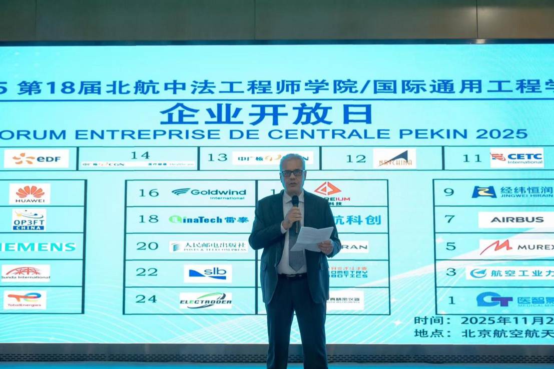 中方院长耿立升在致辞中代表学院向与会企业代表表示诚挚感谢。他介绍,本次“企业开放日”共有25家企业参与,其中10家为首次参加,标志着学院的企业“朋友圈”正在持续扩大。耿立升回顾了学院自2005年成立以来的发展历程,指出2025年正值学院建院20周年,外交部、教育部、工业和信息化部、北京市教育委员会、国家留学基金委、中国教育国际交流协会等政府部门对此高度重视。学院致力于培养具备中英法三语交流能力的通用工程师,为企业海外发展提供有力人才支撑。他还透露,学院正在积极推进教育改革,谋划“十五五”规划,拓宽国际合作办学渠道,推动教育“走出去”,发展海外办学,将中国高等教育模式传播到全球。
