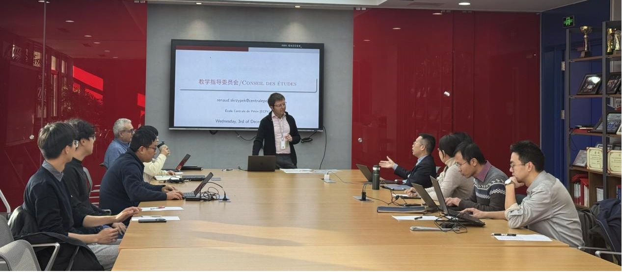 2025年12月3日,学院教学指导委员会会议在二号楼413召开。中方院长耿立升、法方院长Adnane BOUKAMEL、中方副院长黄行蓉、法方副院长Renaud Skrzypek、教学督导组成员及学生代表李邦旭(大三)、徐进(研一)等共同出席会议。会议由法方副院长Renaud Skrzypek主持,围绕本科及工程师阶段课程体系优化、学生法语能力提升及学生幸福感提升等关键议题展开深入研讨,旨在进一步推动学院教育教学改革,提升人才培养质量。