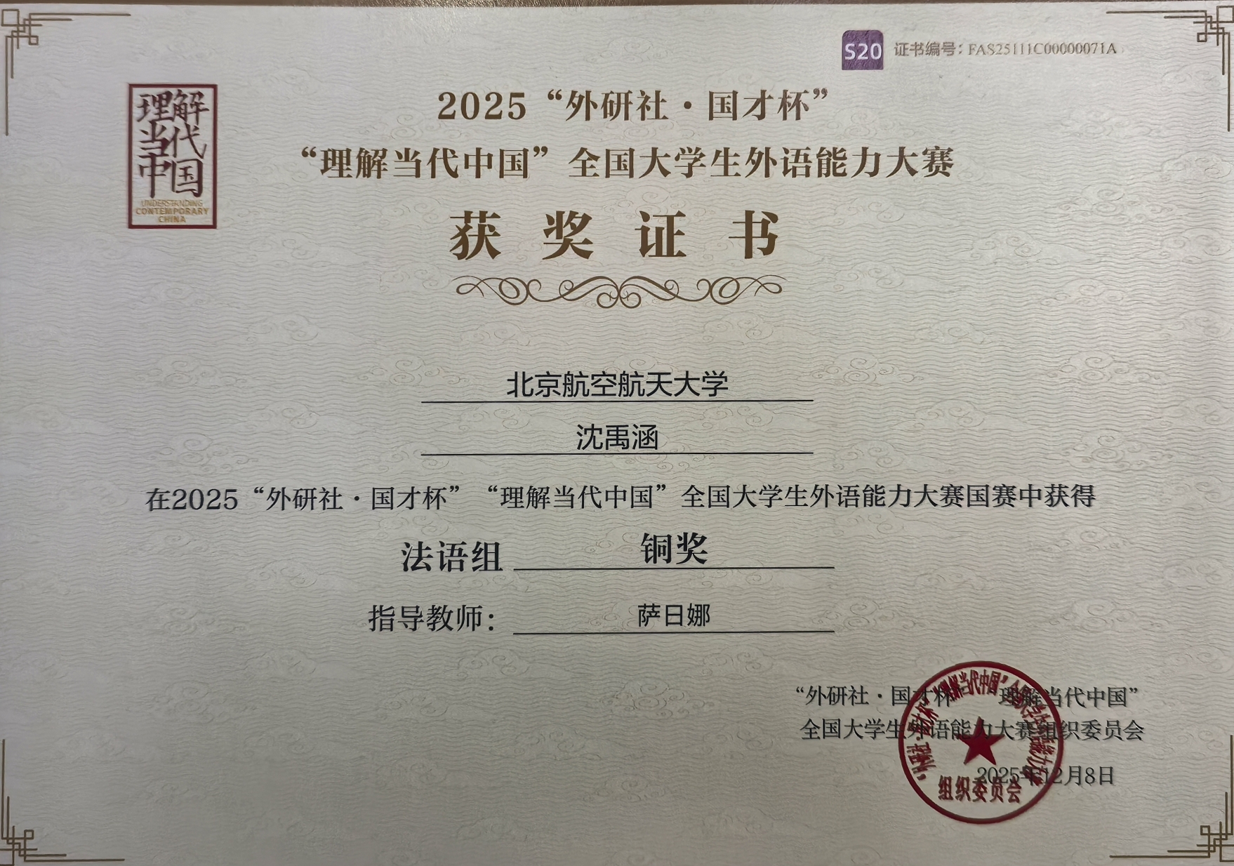 12月8日,2025“外研社·国才杯”“理解当代中国”全国大学生外语能力大赛国赛在北京落幕。我院学子凭借扎实的法语功底与出色的综合能力,在比赛中表现突出,喜传捷报: