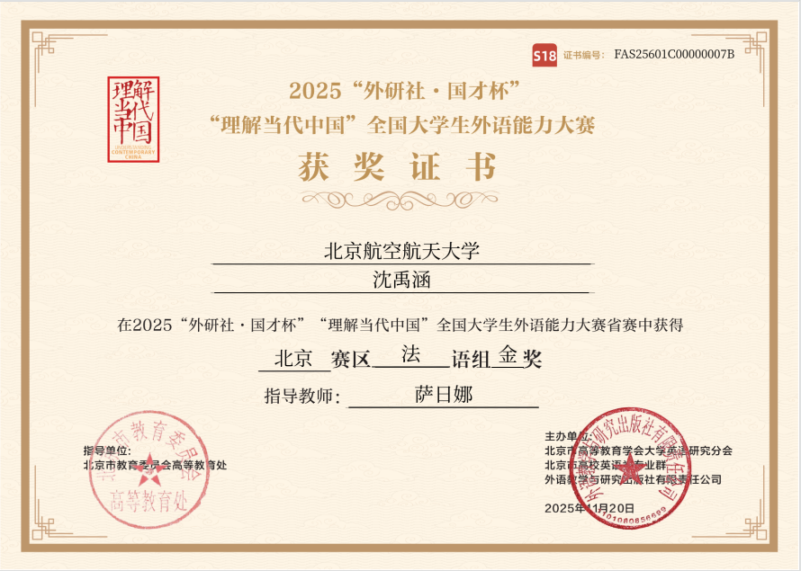 作为我国外语教育领域含金量最高、影响力最广的顶级赛事之一,本届大赛以“理解中国,沟通世界”为主题,自启动以来吸引了全国1537所高校的72.6万人次参与角逐。沈禹涵同学现为本科二年级学生,尽管学习法语的时间仅一年有余,却凭借扎实的能力和沉稳的表现,连闯校赛、省赛、国赛三关,最终脱颖而出,斩获佳绩。