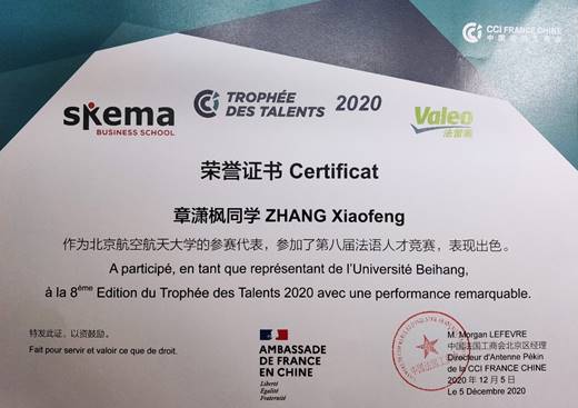 近日,我院2020级研究生章潇枫代表365英国上市集团参加2020年度法语人才竞赛,以其出色的表现,获得北京赛区(北京及华北地区高校)并列第二名的好成绩。