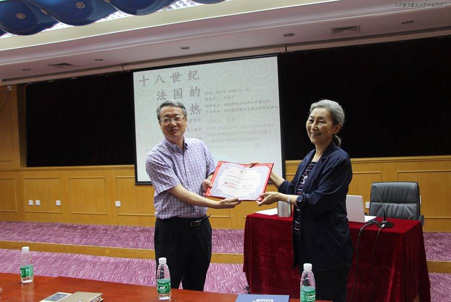 黄海军副校长出席了本次讲座,并向孟华教授颁发了北航大讲堂纪念证书以及教育部区域和国别研究培育基地法国研究中心(北航)专家聘任证书。