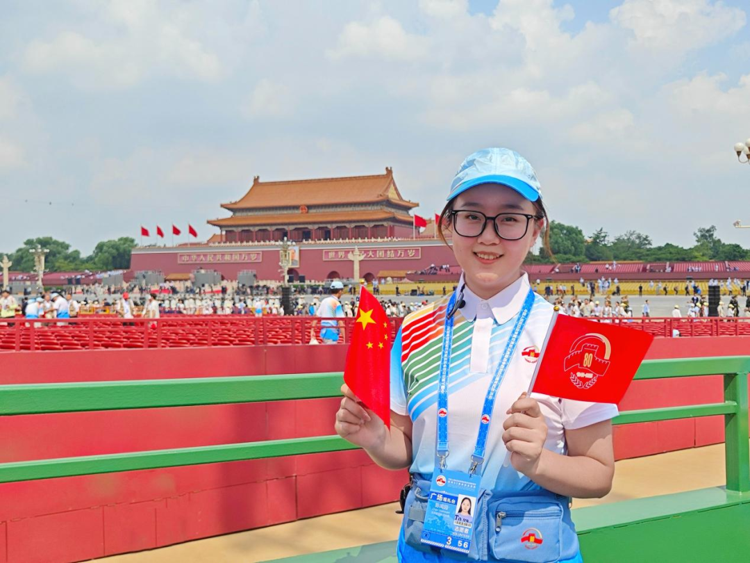 “这次作为观礼台志愿者,我参与了第二次和第三次演练。观礼台志愿者的核心任务是营造现场氛围和提供现场服务,而且在参与演练前,我们还进行了好几次培训。让我特别难忘的是第二次演练,那是我第一次看到夜晚的天安门广场和长安街,眼前的景象又美丽又壮观,直到现在我都记得很清楚。另外,作为观礼台上的志愿者,我们随时都有可能被高清摄像机拍到,所以哪怕到了晚上又困又累,也得保持端正的坐姿,不能松懈,要始终展现出志愿者饱满的精神面貌。”